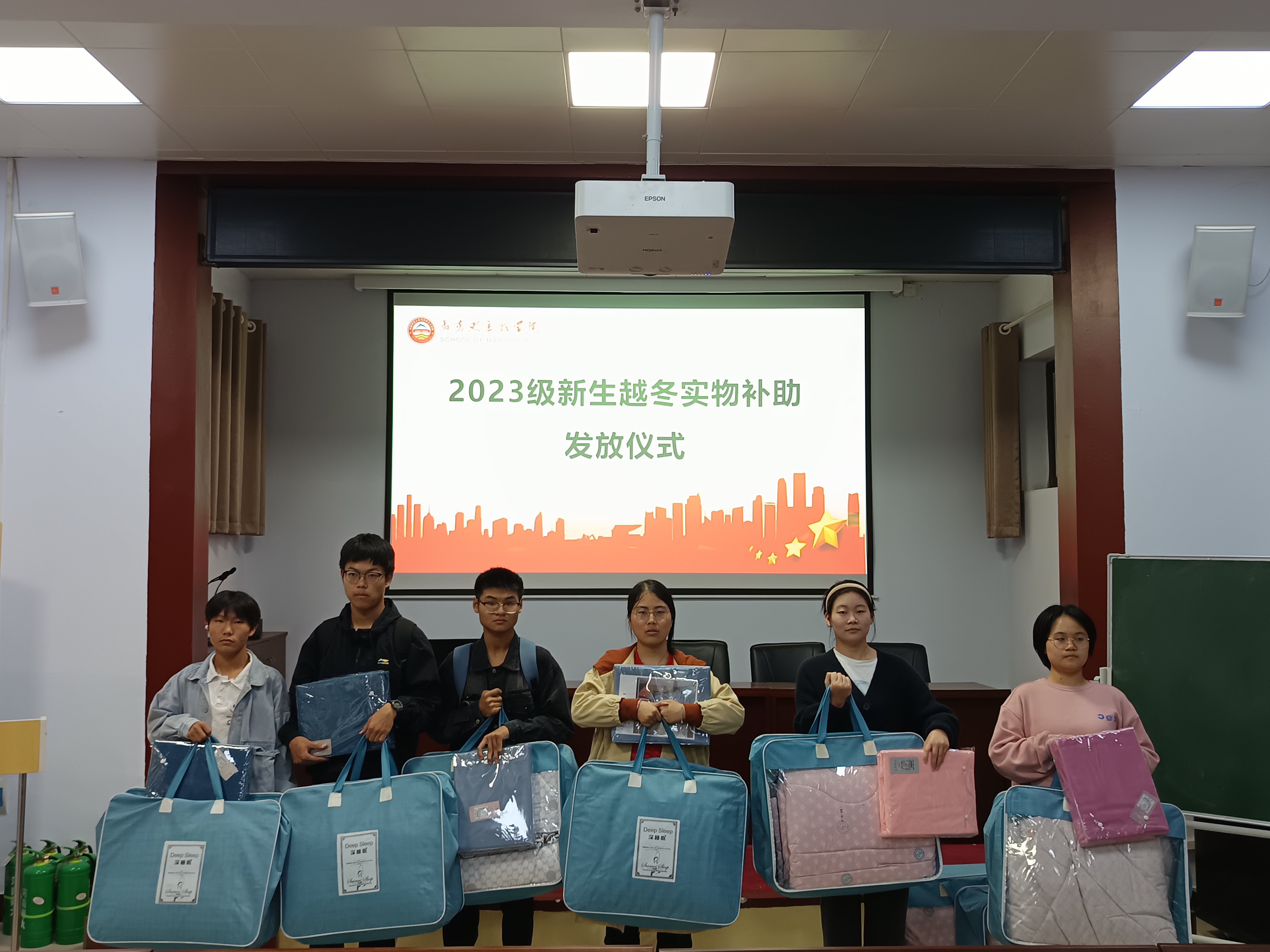 仪式伊始,2023级辅导员薄一凡向大家介绍国家及学校的相关补助政策及评定标准,并宣读获助学生名单。随后,薄一凡、赵澜鑫老师将棉被、床单等越冬实物发放给受助学生。薄一凡指出,冬季实物补助是学校长期坚持开展的一项资助工作,叮嘱同学们防寒保暖,也希望同学们能从中感受到学校的温暖与关怀。受助学生深受感动并纷纷对学校、学院表达感谢,并表示今后将更加用功学习,把学校的关怀作为努力的动力,勤奋刻苦、奋力拼搏,以优异的成绩回馈社会。最后,赵澜鑫作总结发言并提出期望,希望大家在大学生活期间坚定理想信念,学习科学知识,培养优良品德,锻炼强健体魄,从各方面提高自身素质,成长为社会主义的合格建设者和接班人。