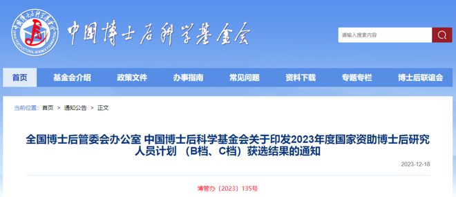 12月18日,中国博士后科学基金会公布2023年度国家资助博士后研究人员计划(B档、C档)获选结果,我院博士后田良斌获批C档资助。