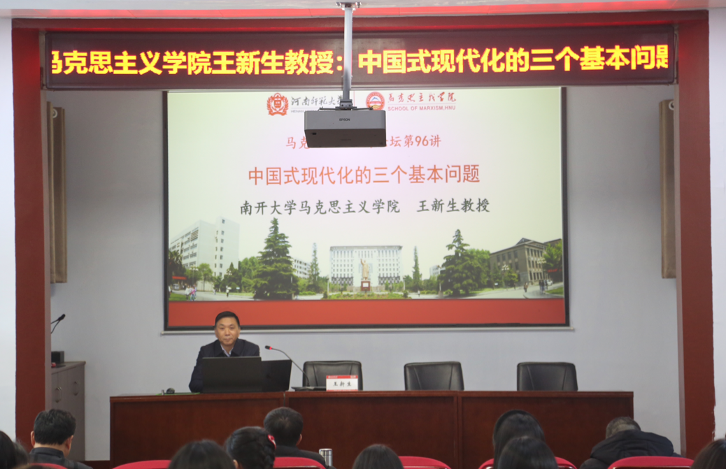 12月24日下午,教育部长江学者特聘教授、南开大学马克思主义学院院长王新生教授应邀为我院师生作题为“中国式现代化的三个基本问题”的学术讲座,这也是伟德官网下载苹果版马克思主义牧野论坛第96期。讲座在平原楼108举行。马克思主义学院教师代表和全体硕博研究生参加了此次讲座。此次讲座由马克思主义学院党委书记、院长蒋占峰教授主持。