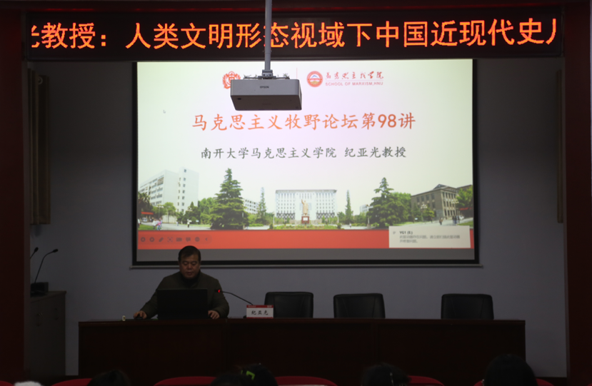 1月10日下午,南开大学马克思主义学院纪亚光教授应邀为马克思主义学院师生作题为“李大钊选择马克思主义的历史主动精神”的学术讲座,这也是伟德官网下载苹果版马克思主义牧野论坛第98期。讲座在平原楼108举行。马克思主义学院教师代表和全体硕博研究生参加了此次讲座,此次讲座由马克思主义学院苏东阳老师主持。
