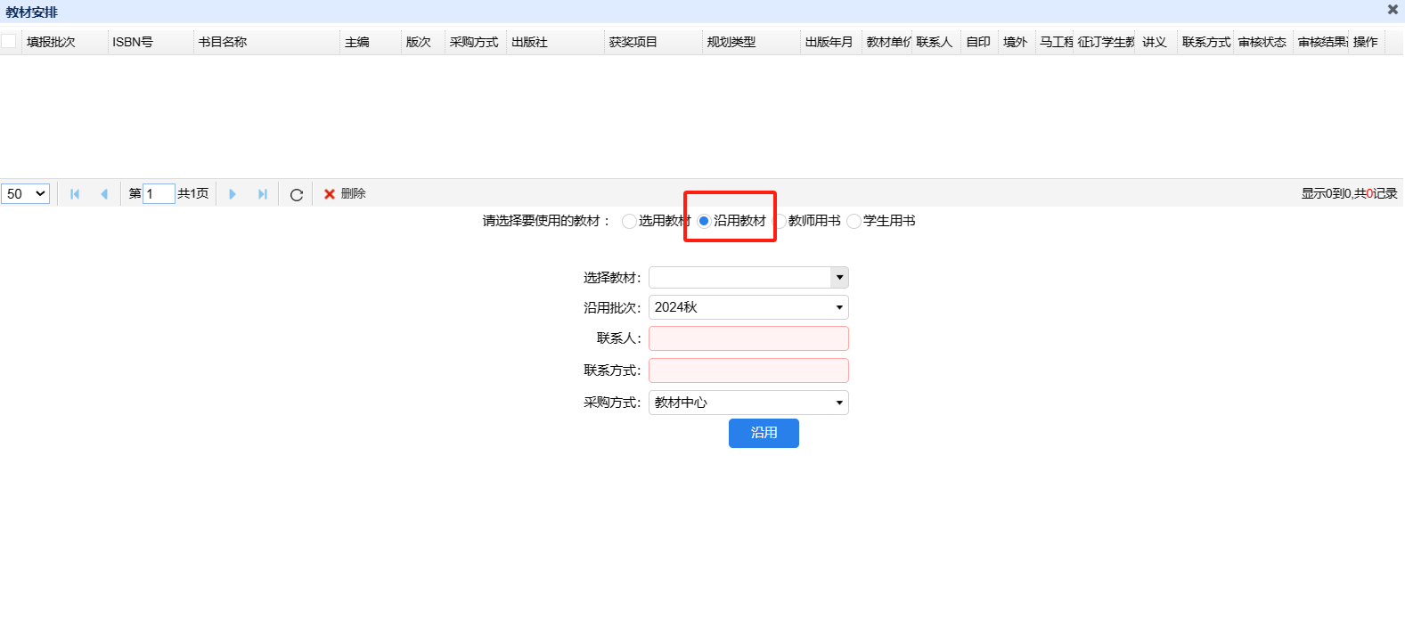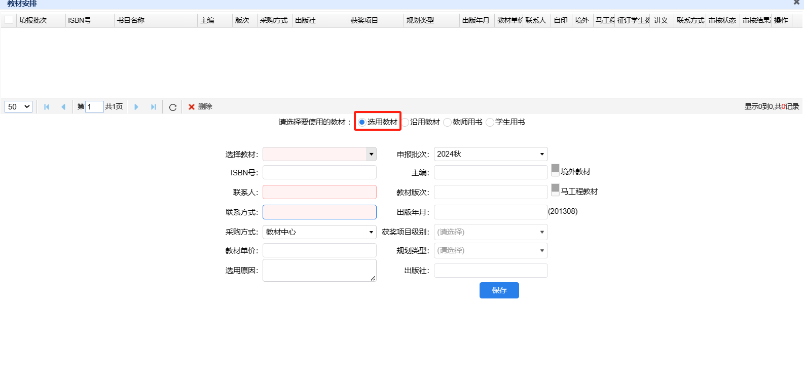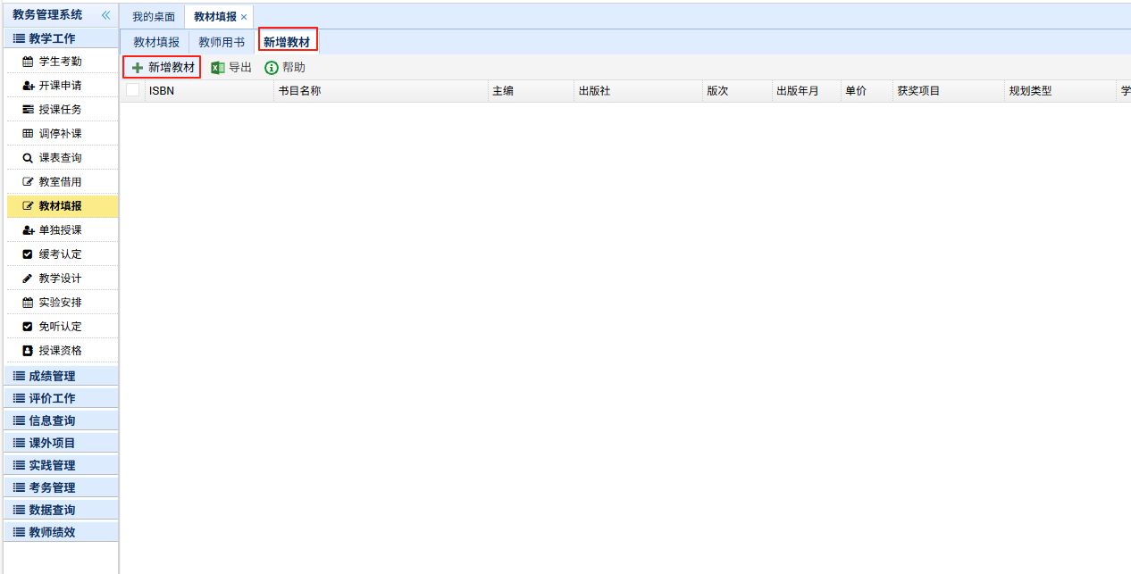 (三)新增教材。如教务系统书目库未包含课程所需教材,需先在教务系统中书目库中填写“新增教材”,提交审核通过后,方可进行教材填报。