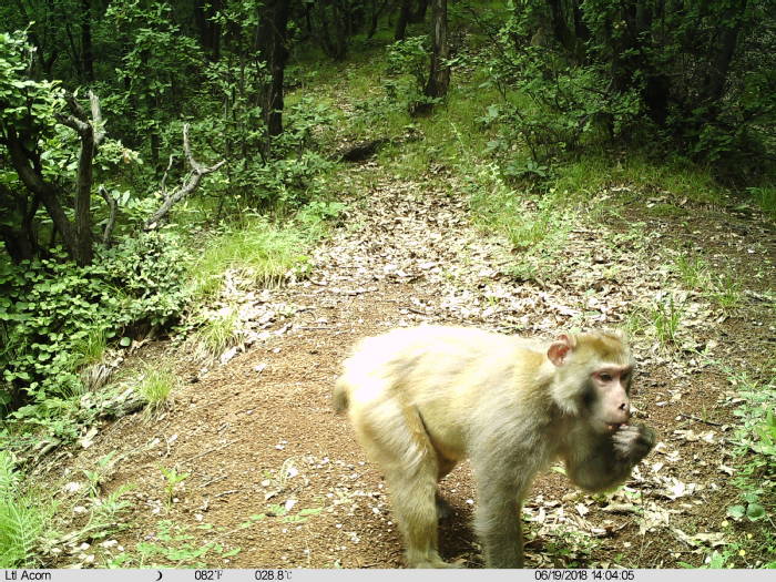 以树叶、嫩枝、野菜等为食,也吃小鸟、鸟蛋、各种昆虫,甚至蚯蚓、蚂蚁。采食野果贪婪嗜争,边采边丢,只食甜熟果子,未熟果却丢弃,故猴群过处往往遍地断枝弃果,因而对野果的可利用程度较低,必然要扩大觅食范围,活动时间也往往较长。