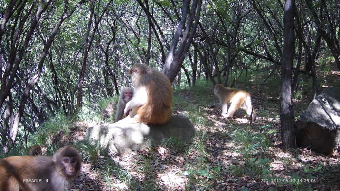 猕猴(学名:Macaca mulatta):体长51-63厘米。是典型的猕猴属动物,主要特征是尾短,具颊囊。躯体粗壮,平均体长约50厘米,它们的前肢与后肢大约同样长,拇指能与其它四指相对,抓握东西灵活,前额低,有一突起的棱。头部呈棕色,背部棕灰或棕黄色,下部橙黄或橙红色,腹面淡灰黄色。