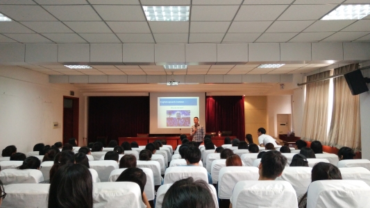 杨磊老师以“我们为什么会在这”这个问题开始本次培训会,他通过请现场同学回答问题的方式,进一步阐明演讲的重要性。接着,他讲述了如何准备及如何进行一场演讲比赛并给大家提出具体的五个步骤。杨老师提到若想做一个好的演讲,首先要掌握“Accuracy、Fluency、Variety、Appropriateness、Elegance、Confidence”五个关键词,随即,他针对每个关键词都做出详细解释。在解释“Variety”的时候,他以自我介绍为例,生动形象地对比了两种不同介绍方法效果的差异,借此说明词汇丰富的重要性。最后,杨磊老师结合自己带学生参加全国英语演讲比赛的经验对即兴演讲环节提出建议,他指出抽完题目后首先要在自己心里有一个大纲,在比赛开始之前可以在角落里面对观众先练习一遍。杨磊老师幽默诙谐的语言不时引得到场学生的阵阵掌声,会后同学们纷纷表示受益匪浅。