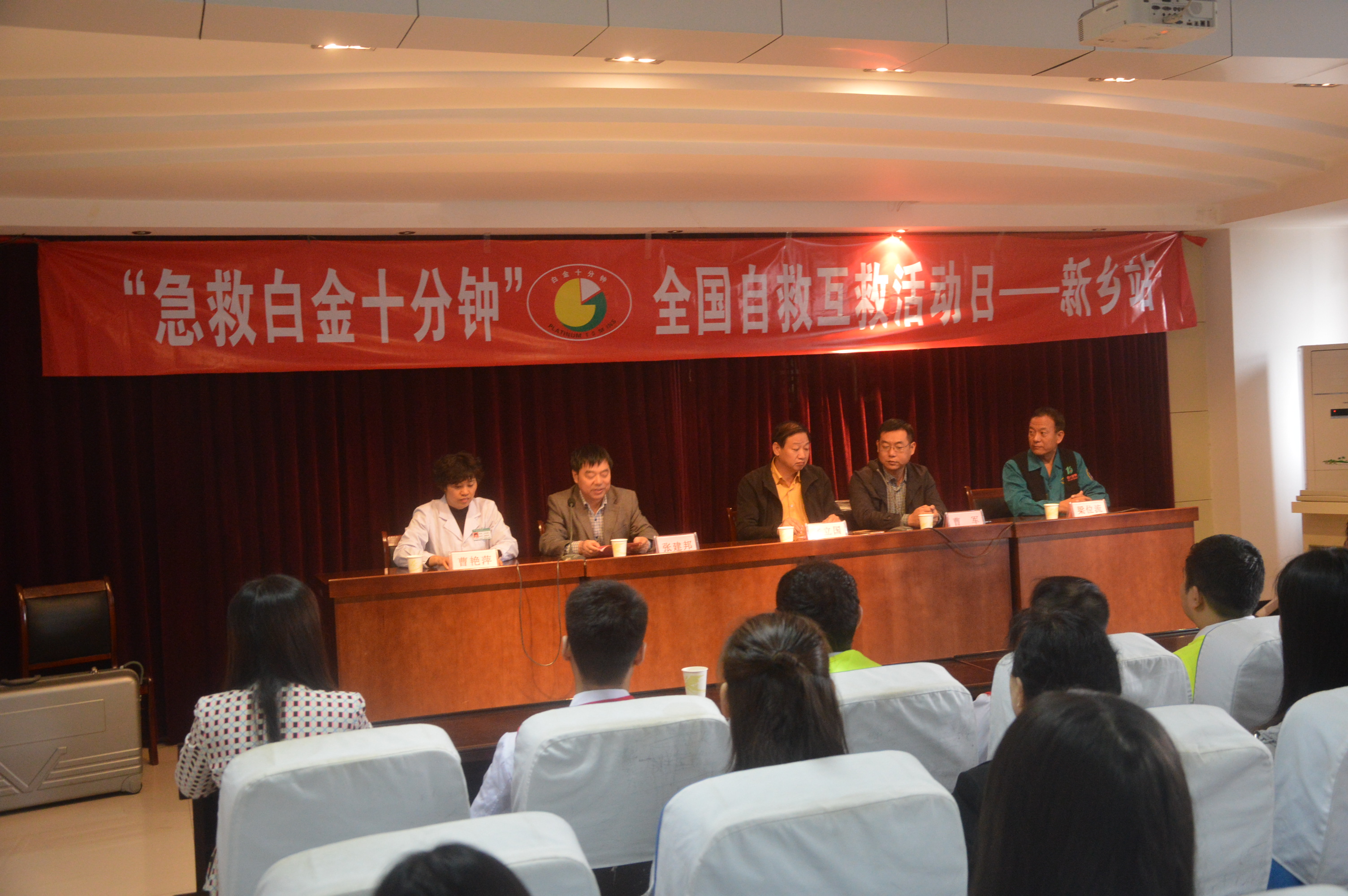 活动伊始,新乡市中心医院副院长张立国宣读“急救白金十分钟,全国自救互救活动日”倡议书。随后,新乡市中心医院急诊科主任曹军向副主任梁位流授旗。紧接着,梁副主任带大家回顾“新乡市急救白金活动日”,他解释道:“急救白金10分钟”是指伤病发生后,在专业人员不能到达的情况下,时效最重要、救治最薄弱的最先10分钟左右时段,以及在这个时段内伤病救治的时效性原则和理论,如在猝死、电击伤、车祸伤、溺水事件发生的最初10分钟内,采取紧急的自救互救措施,可以极大提高救治成功率。梁副主任还利用PPT向大家展示新乡市中心医院开展的系列急救白金活动,强调急救的重要性。活动最后,专业人员进行心肺复苏、创伤急救处理以及气道梗阻的解决方法等急救技术演示,学生们都认真观看,记录要点。培训现场,急救人员亲身指导我院学生进行心肺复苏学习,学生积极提问,踊跃参与,并表示受益匪浅。