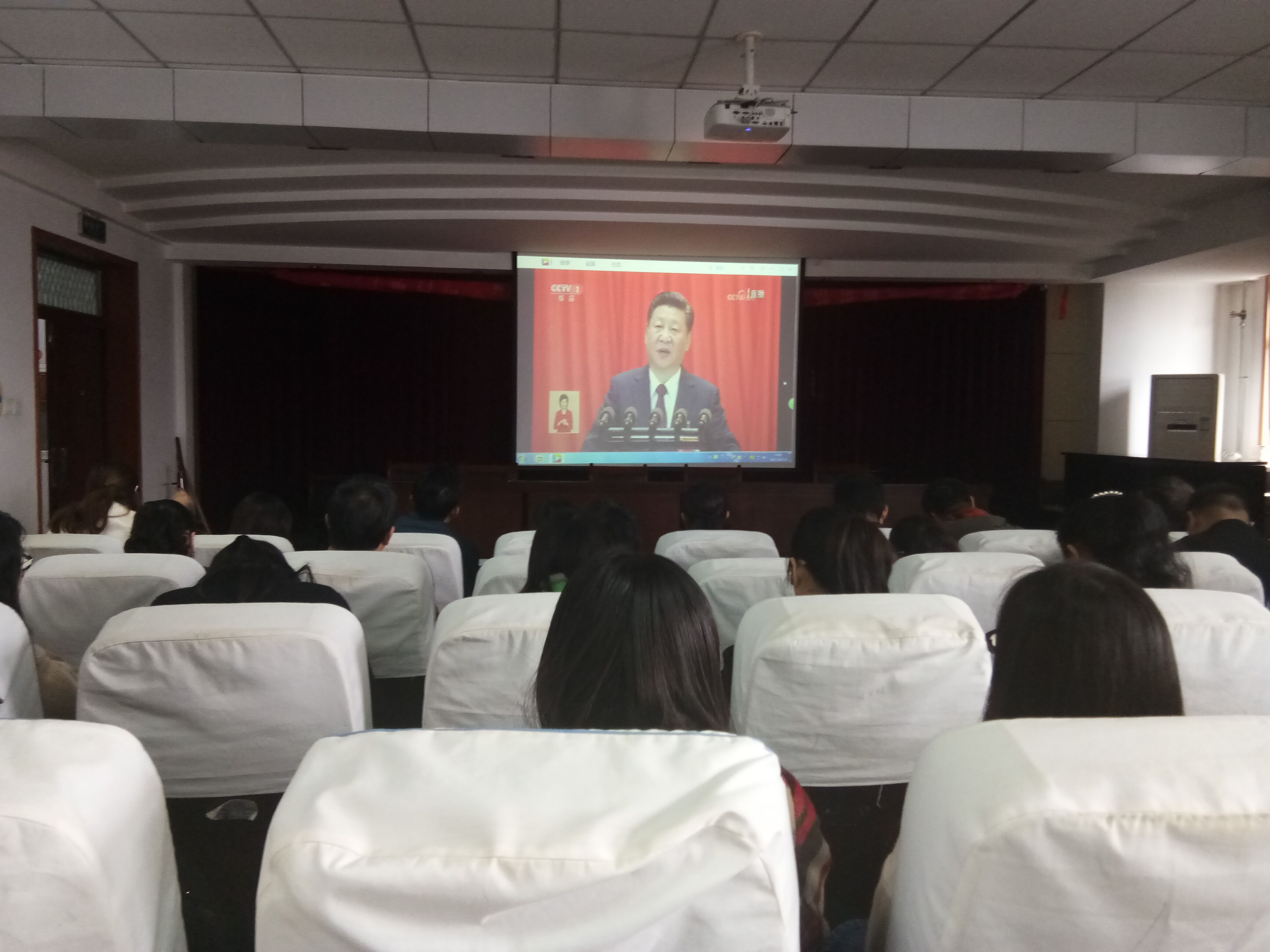 寄托中国人民美好愿望,肩负中华民族伟大使命。党的十八大以来,以习近平同志为核心的党中央领航中国号巨轮向光明的彼岸破浪前行,推动我国发展掀起新篇章,中国特色社会主义进入了新的发展阶段。党的十九大的召开关乎着我国在关键时期的新走向、新发展。在庄严肃穆的国歌声中,现场观看人员全体起立,迎接大会的开幕式。习近平总书记在报告中表示,要不忘初心、牢记使命,高举中国特色社会主义伟大旗帜,决胜全面建成小康社会,夺取新时代中国特色社会主义伟大胜利,为实现中华民族伟大复兴的中国梦不懈奋斗。在场师生认真聆听习近平总书记代表第十八届中央委员会所作报告的内容,并做好相关记录,观看现场掌声不断。习总书记报告完毕之后,同学们纷纷表示受益匪浅。