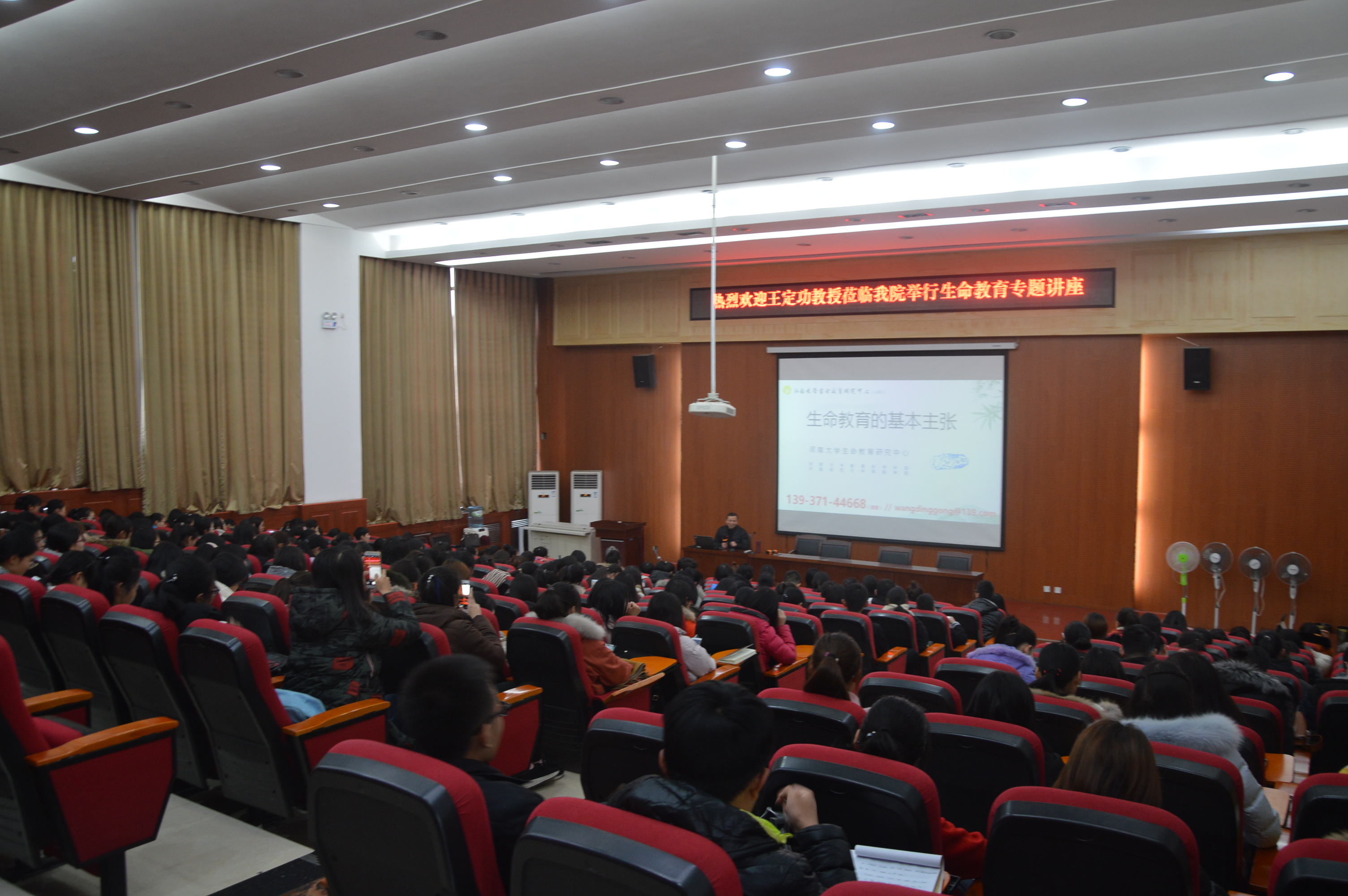 教育学院“对话美丽生命,绽放精彩人生”——“幸福人生”领航工程是我校学生工作特色品牌项目。王定功教授结合自身对生命教育的研究实际,针对我院“对话美丽生命,绽放精彩人生”——“幸福人生”领航工程品牌项目,从“生命教育何来?生命教育何谓?生命教育何为?生命教育何往?”四个方面来阐述生命教育。王教授认为教育的本质是生命教育。他提出“生命教育是以生命为基点,借助生命资源,唤醒、培养人们的危机意识与生命智慧,引导人们追求生命价值,活出生命意义活动”的观点,与我院品牌项目“丰富育人文化,奠基幸福人生,培育和谐人才”的目标相契合。
