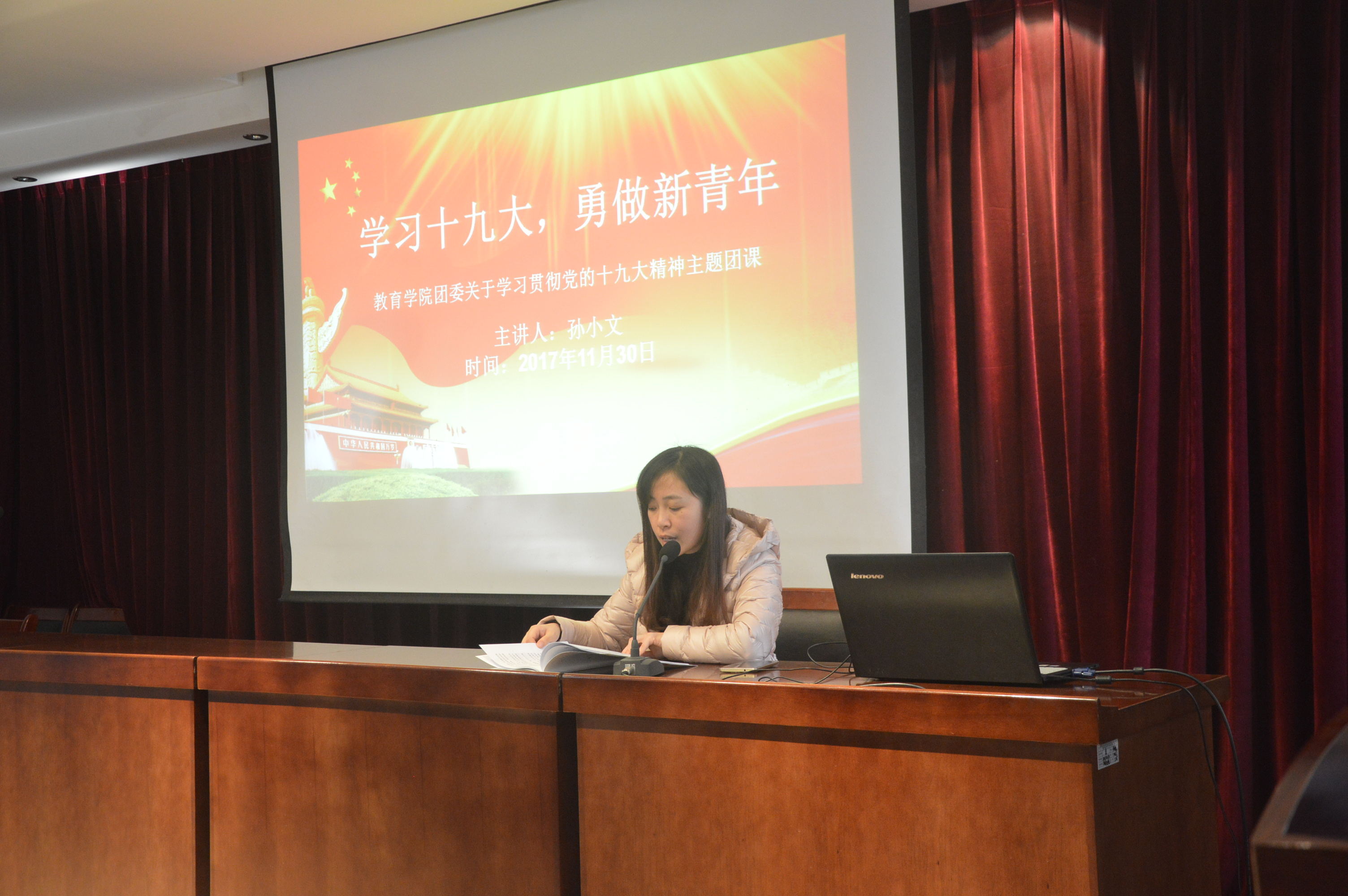 为深入学习习近平总书记在中国共产党第十九大全国代表大会上的报告,学习治国理政新理念、新思想、新战略,切实增强团员青年的先进性和荣誉感,让团员更像团员。11月30日中午,教育学院于田家炳教育书院812教室开展了以“学习十九大,勇做新青年”为主题的团课活动,团委书记孙小文带领教育学院2016级,2017级同学进行学习。