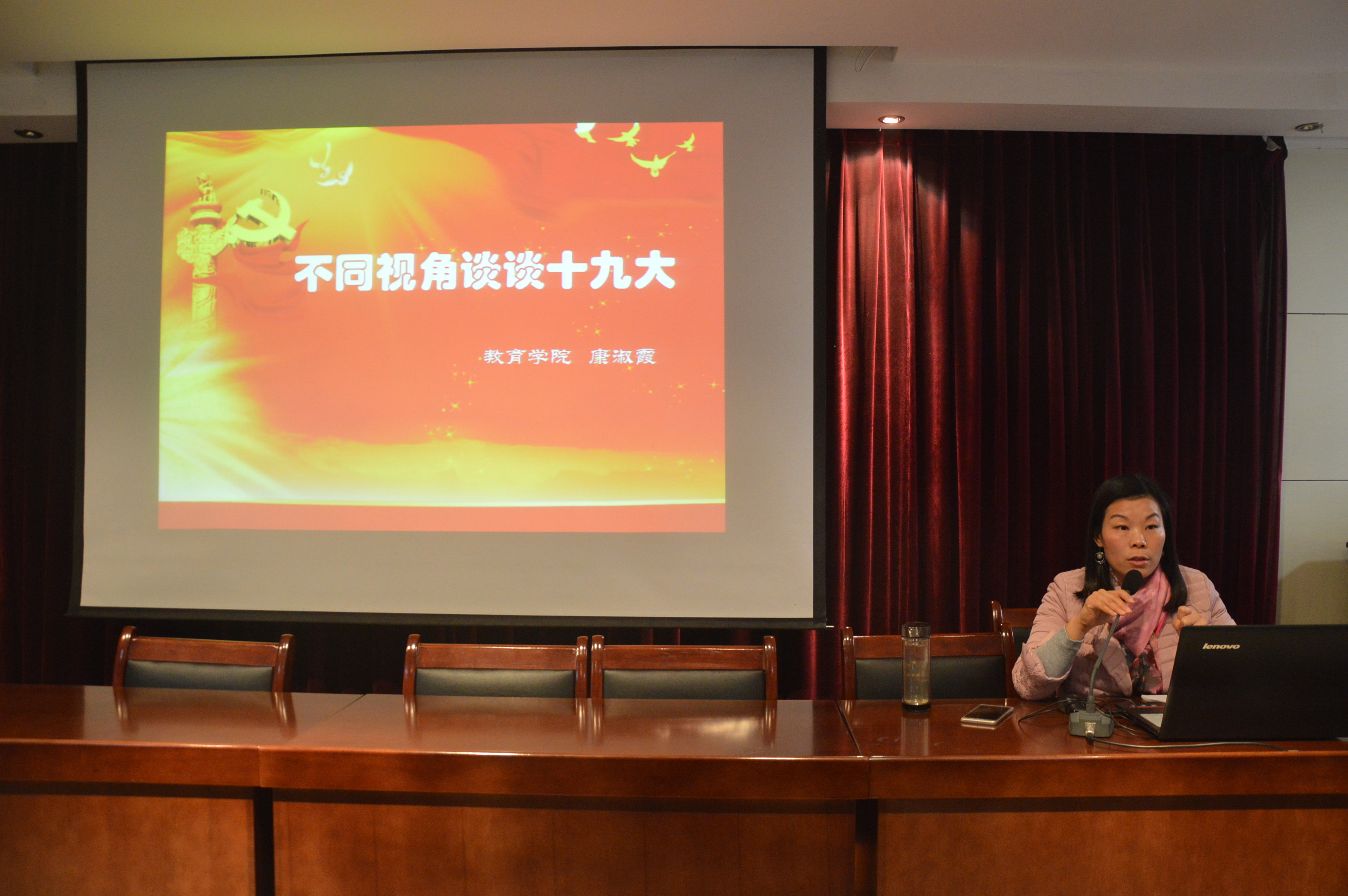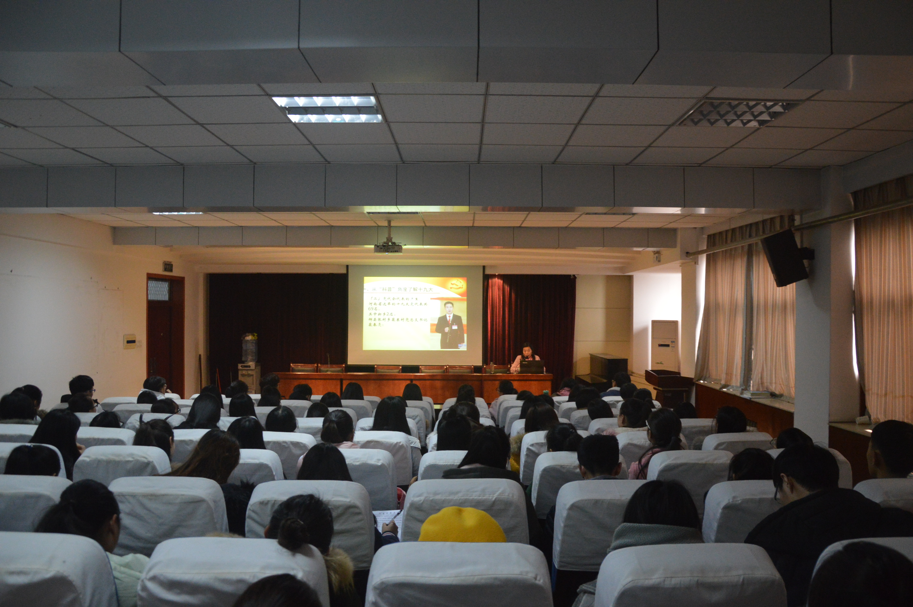 学院党委副书记康淑霞从“科普”角度了解十九大、从党史角度认识十九大、从青年角度关注十九大等三个维度,对中国共产党全国代表大会与“两会”的区别、历次党代会的召开及历届各中央全会的主题等进行了全面解读。结合十九大报告,康书记指出,在新时代青年是两个阶段发展目标的见证者、亲历者、受益者;在新时代,贡献聪明才智、努力建功立业、实现人生价值是青年的应然状态;在新时代,青年可以大有作为、应当大有作为、必须大有作为、也必将大有作为。作为新时代青年,应当具有正确坚定的政治立场和理想信念、严谨高效的学习态度和工作作风、卓越主动的人生目标和奋斗状态、奉献共赢的处世风格和团队精神。