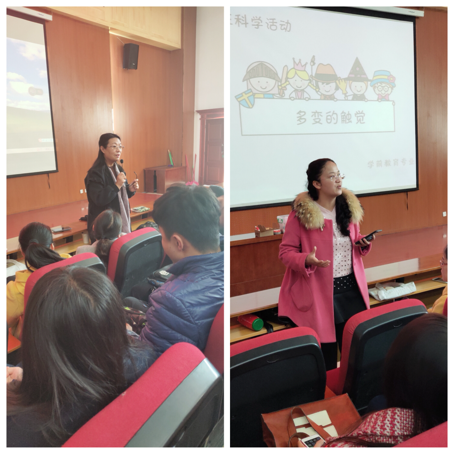 分享会共分为说课展示和技能展示两个部分。说课部分共有四个环节,分别是说课者讲述、参与者自评、在校学生评、教师总评。许俊飞由中班健康活动《小刺猬搬家》开始,生动的语言、标准的动作以及活跃的课堂效果迎来了阵阵掌声。讲述完毕后由张晴和杨亚萍针对说课进行提问,并对本节课的优缺点进行补充总结,现场同学也根据自己的理解对讲述内容进行提问,然后由老师进行总结阐述。接着是大班语言活动《米宝宝去旅行》及小班科学活动《多变的触觉》,课程中好玩的游戏、精美的教具设计吸引了在场所有人的目光。在技能展示环节,许俊飞展示了作品图片,根据每个作品的问题进行简单总结,并向同学们传授经验。本次分享旨在让同学们掌握课程设计的方法与技巧,为说课及技能比赛提供前期准备,通过引领与示范作用带动学生共同营造良好的学习氛围。