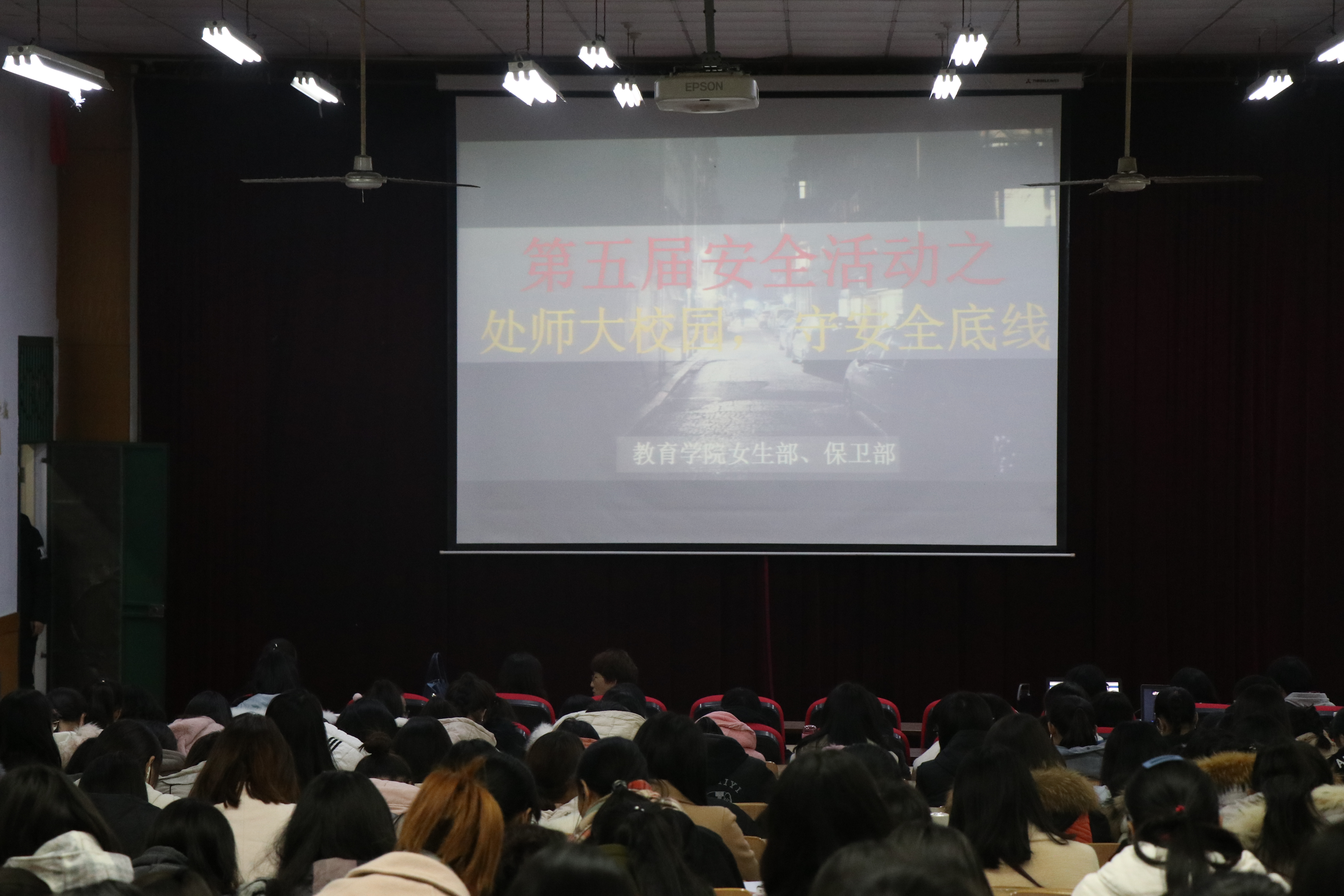 12月1日,由教育学部团委举办的第五届安全知识讲座之“处师大校园,守安全底线”活动于多功能报告厅开讲。校保卫处政保科科长刘茜茜、教育学部党委副书记康淑霞、团委书记孙小文应邀出席。