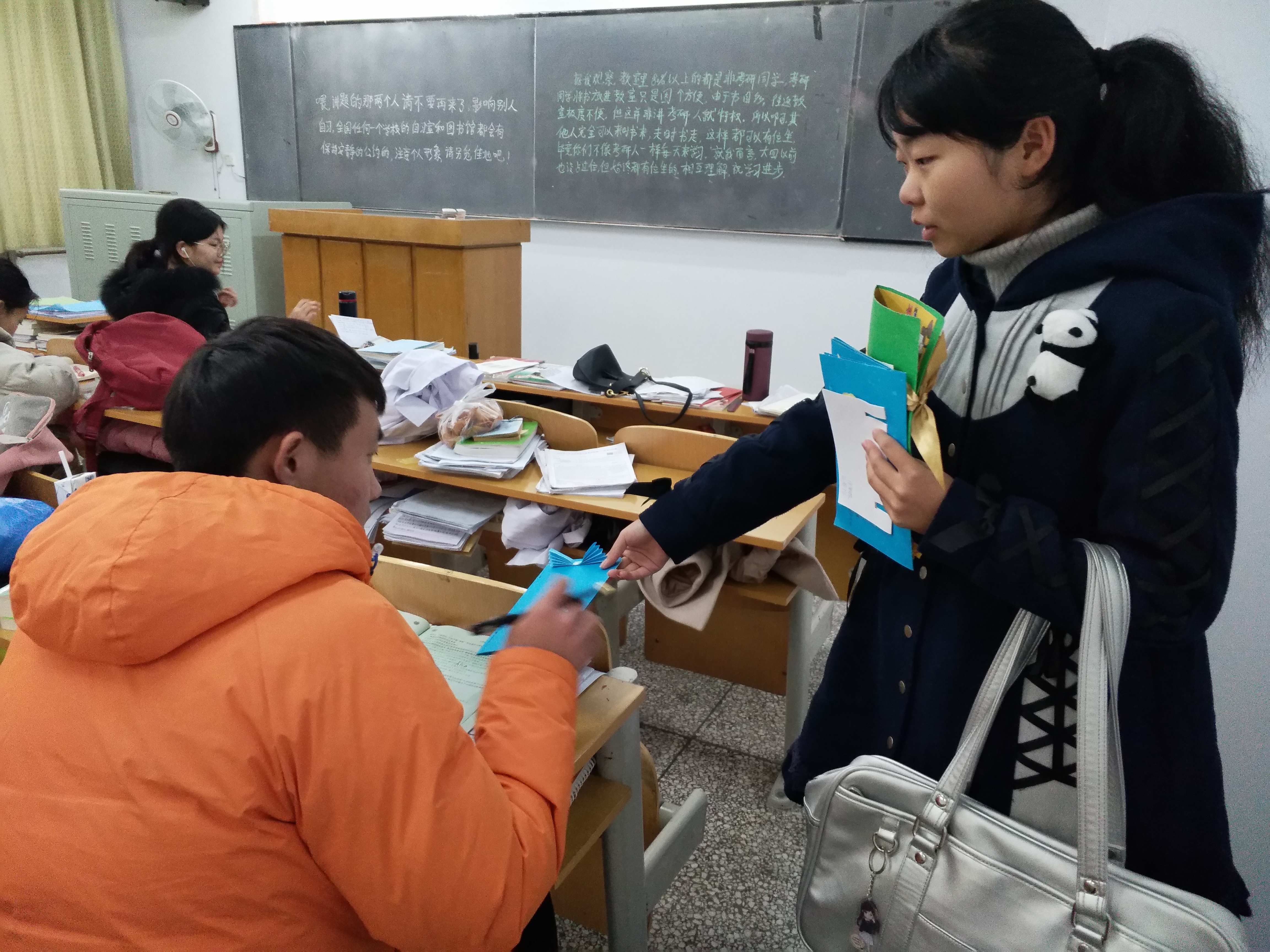 活动前期,同学们将“情系考研生,冬日送温暖”主题巧妙的融入制作的贺卡中,表达自己对考研学生的诚挚祝福。活动伊始,志愿者们分批次到各个考研教室为学长学姐送去贺卡祝福,并与他们进行了愉快的交流谈话。学长学姐纷纷表示自己在辛苦的学习过程中能够收到如此温暖的祝福真的非常开心,给了自己很大的鼓励。其中,学前教育专业的一位学姐说道:“希望学弟学妹们也能够努力学习,为将来的考研做准备!”最后,志愿者团队集体合影留念,活动由此落下帷幕。