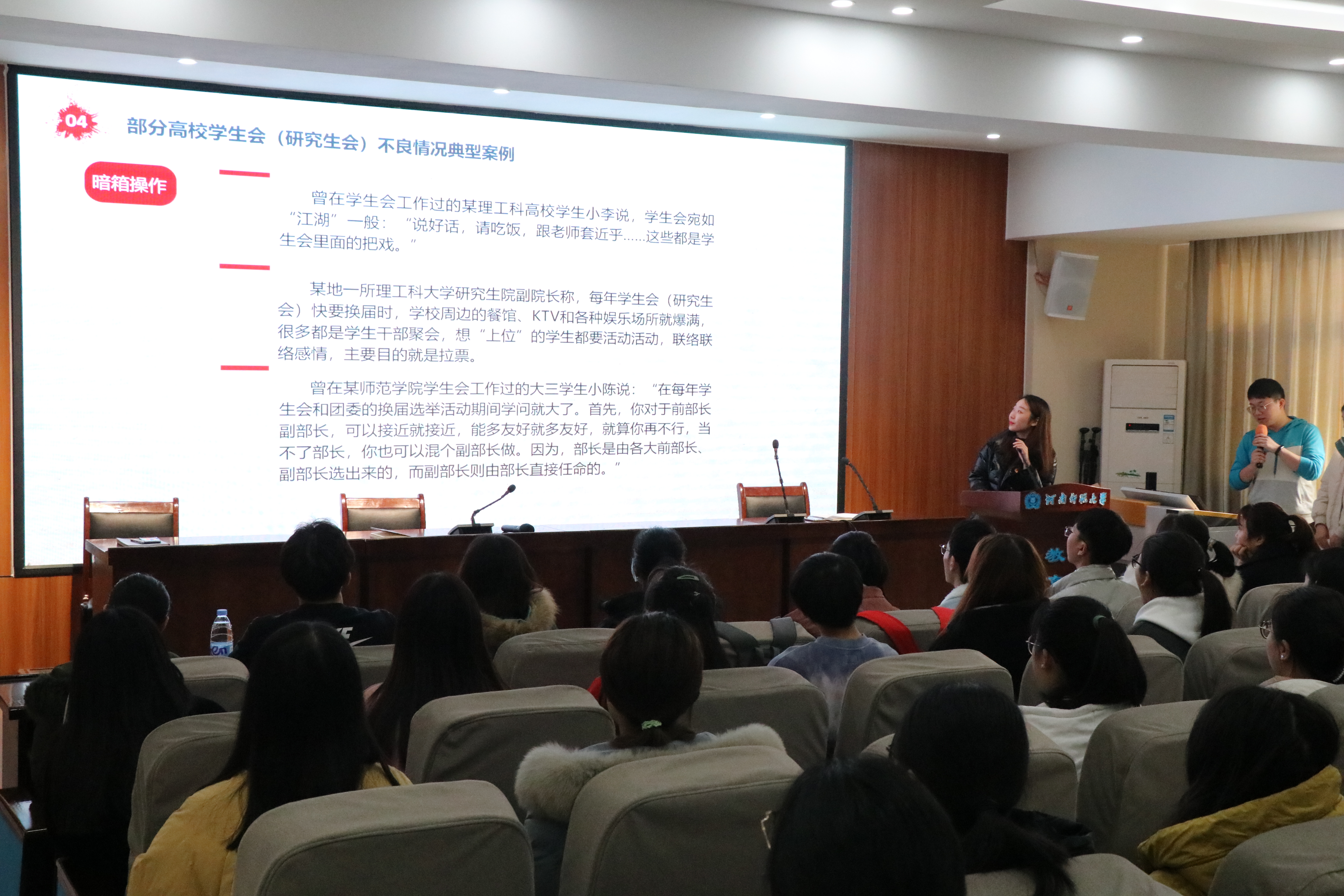 为进一步优化学生会干部工作作风,提高学生会成员工作能力,12月10日,教育学部在田家炳教育书院819教室举办学生会作风建设警示教育会。教育学部团委学生会全体成员参会,会议由学生会主席赵俊杰主持。