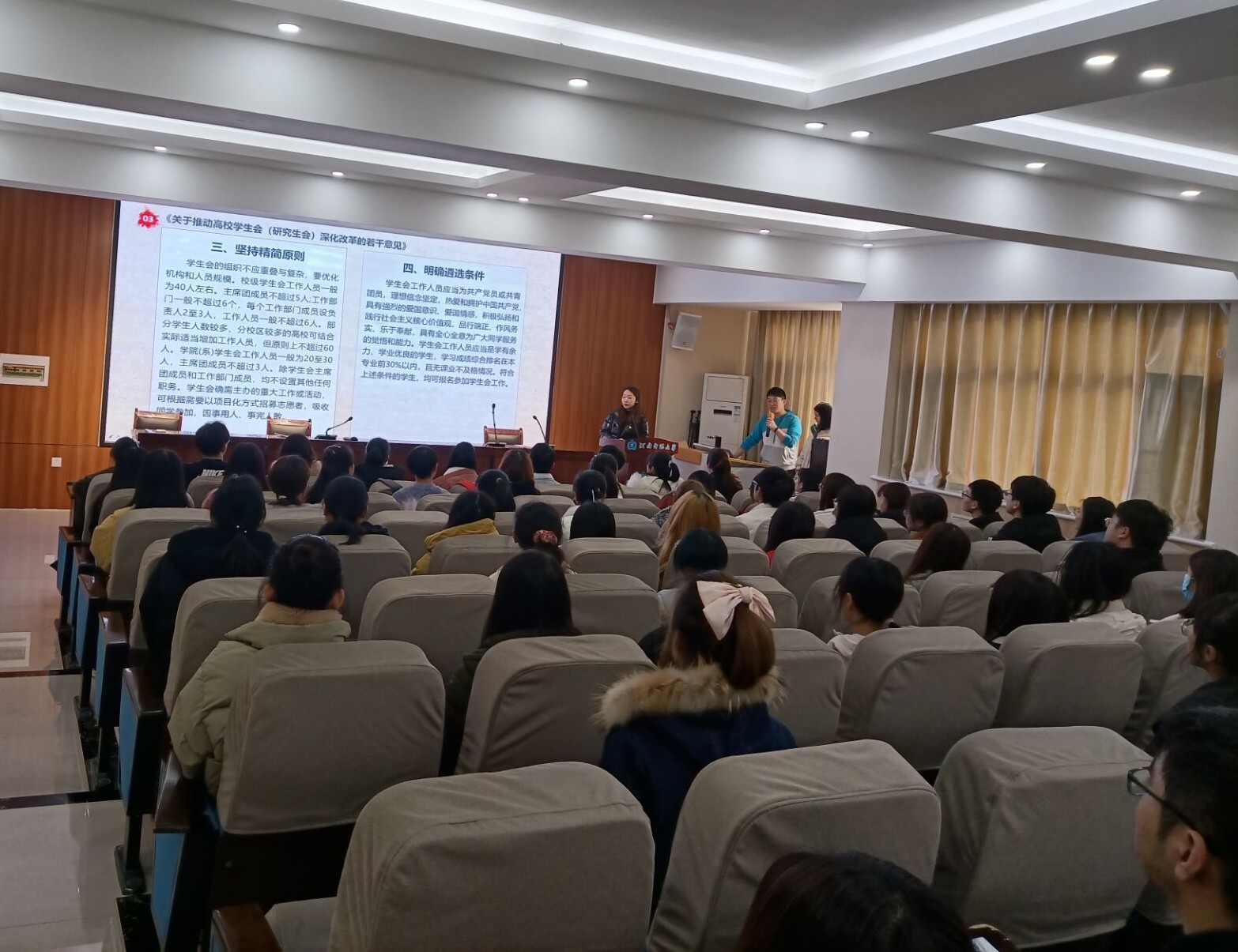 会中,赵俊杰宣读了《关于推动高校学生会(研究生会)深化改革的若干意见》和《关于落实共青团和学联对高校学生会(研究生会)指导管理的若干规定(试行)》,以此来强调学生会工作的重要性,并使学生会成员对自身职能定位有清晰的认识;他倡议学生会成员应遵循恪守学生本分、牢记服务宗旨、永葆理想情怀、勤勉务实做事、营造平等氛围和摒弃庸俗习气六大原则,尽心尽责,认真完成工作。在座学生干部反响热烈,纷纷表示会不断提高自身素养,全心全意服务同学。