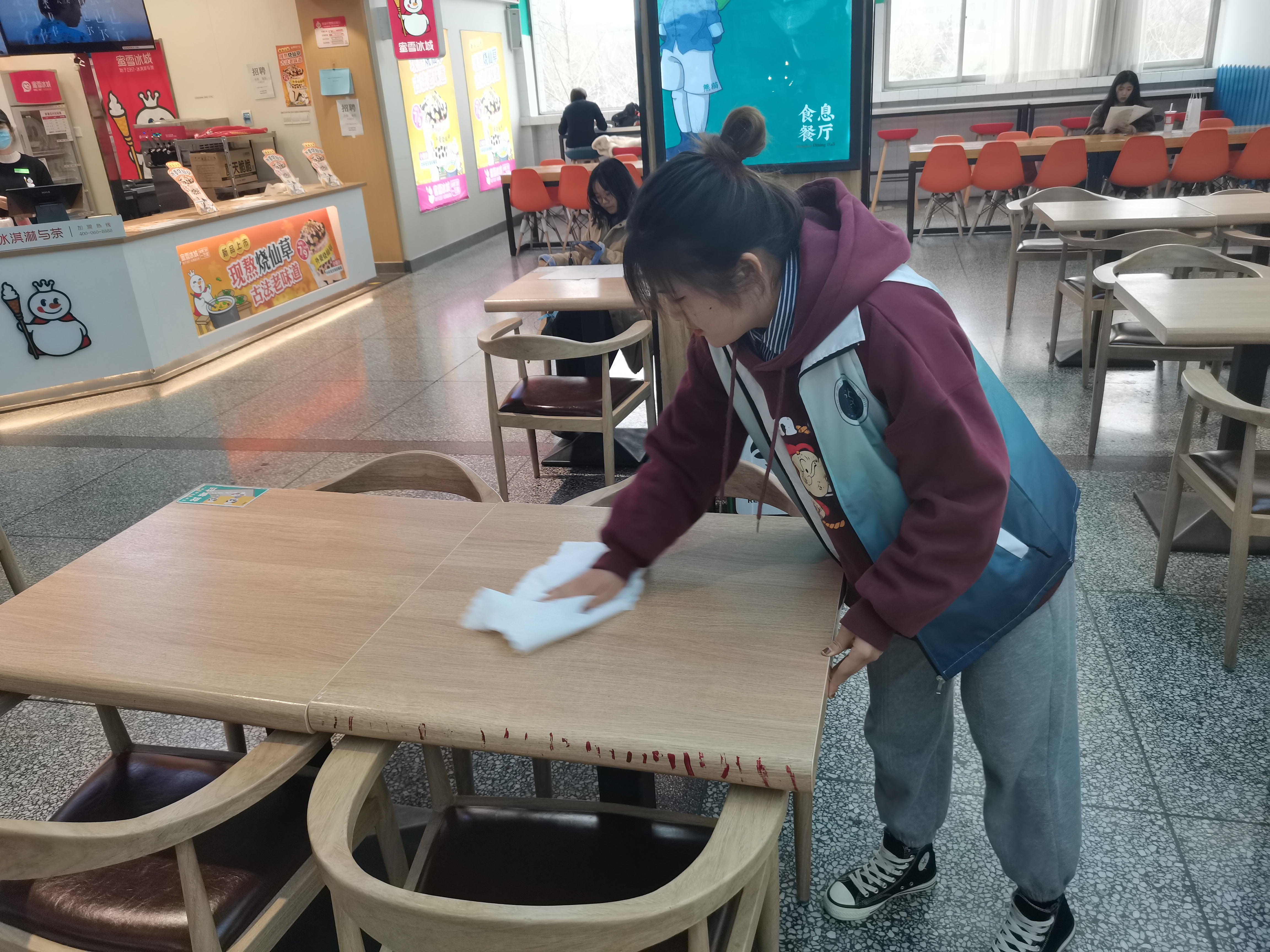 活动前期,负责人为志愿者分配清洁工具并带领志愿者对餐厅的打扫、消毒等环节进行讲解和示范。活动期间,志愿者们积极热情为同学们服务,主动协助餐厅工作人员维持就餐秩序,耐心引导同学们排队就餐,帮助餐厅工作人员清理桌面和回收餐具,提醒同学们用餐后自觉将餐具送至回收处,并向同学们倡导光盘行动。志愿者们的表现得到了广大师生的一致好评。就餐高峰期过后,志愿者与餐厅工作人员对餐厅桌椅和地面进行了清洗和打扫。