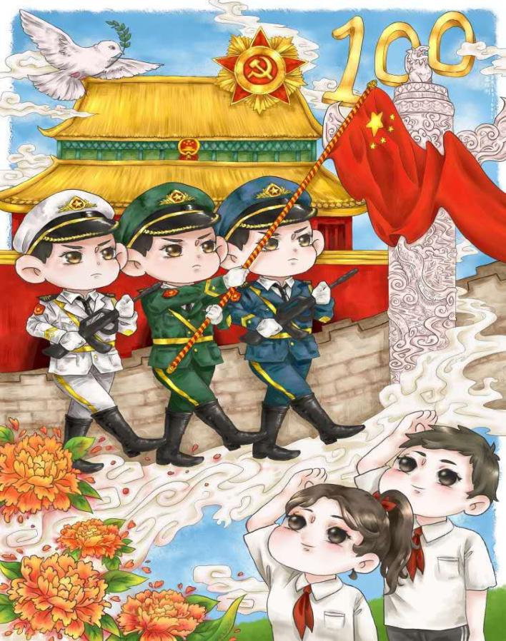 本次活动一经开展便反响热烈,共收到作品98份。在此次活动中,同学们紧扣主题,发挥自己的创作才能,同学们紧扣主题,充分发挥自己的创作才能,展现了学部学子学习党史、坚定信仰的使命与担当。其中,李欣桐同学的板绘作品以少先队员致敬人民解放军为切入点,巧妙地将青春力量汇入爱党情怀中,描绘了一幅青春画卷;王子娟、金源同学分别以五星红旗与红领巾作为主要构图元素创作作品,激励着新时代青年为中华民族伟大复兴而不懈奋斗;刘晓庆、陆韦婕几位同学在作品中分别回顾了我党百年的光辉历史以及所取得的伟大成就,点明了“不忘初心、牢记使命”的永恒主题。