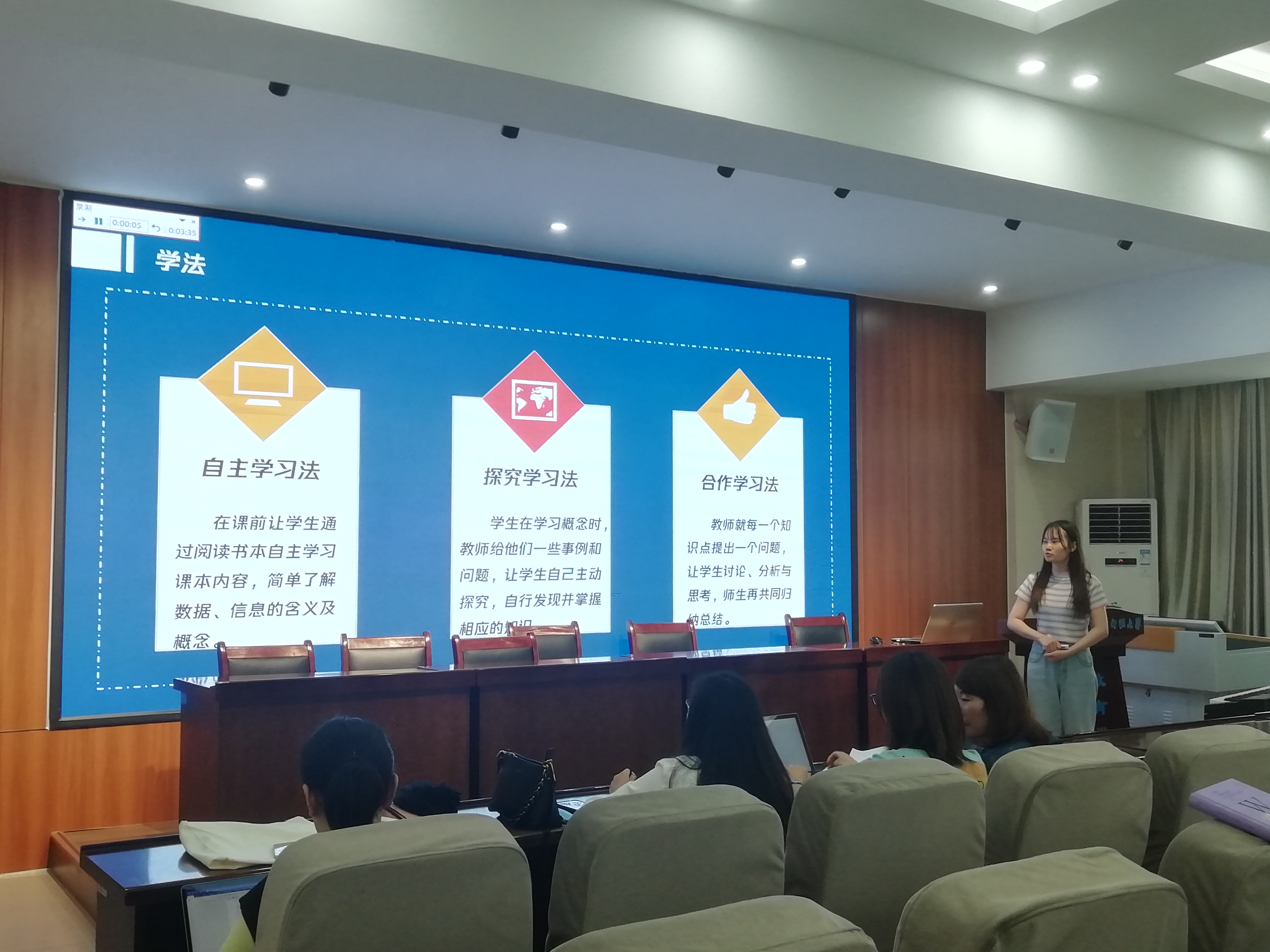 比赛前,所有参赛选手通过学习说课的步骤和方法,观看相关教学技能精品课程,按要求进行了充分的赛前准备。比赛以说课、答辩、才艺展示为主,每位参赛选手15-20分钟,依次进行了活动展示。每位选手通过说教材、说学情、说教学目标、说教学过程等内容,在三尺讲台上绽放自我风采,展现良好的教师素质。例如,张彤同学将教学分为课前、课中、课后三个阶段,并设计自主学习、探究学习、变式练习等多种课堂活动;曹航绮同学通过观看“德国的鸭子会看红绿灯过马路”的视频吸引同学们的注意力,且采用任务驱动法来引发学生进行思考。
