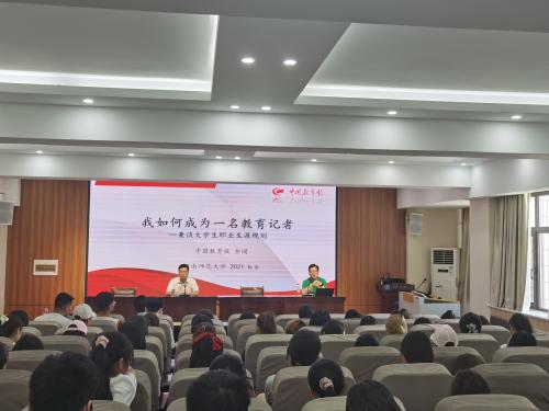 余闯向师生们讲述了自己的求学和工作经历,介绍了自己在中国教育报的主要工作内容,并指导学生要注意新闻语言与学术文章措辞的不同,多用心感悟,多写、多练笔。通过对自己职业生涯的深入介绍,余闯对同学们的职业生涯规划提出建议。他认为在选择职业的过程中,要做到“三问”,一问我是谁,二问我去哪,三问怎么去。而要想答好三问,就必须具备学习的能力、自我的修炼、独立的品格等特质。