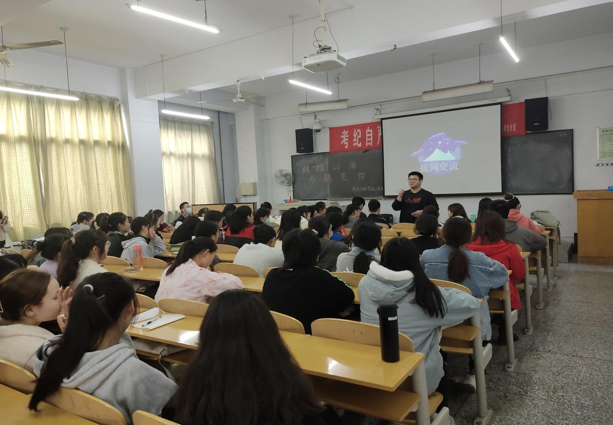 2020级教育学专业学生常雅菲作为主讲人针对新生普遍关注的问题进行了详细介绍,内容主要包括:第二课堂学时获取、综合测评相关内容、体测成绩标准以及如何预防电信诈骗等事宜,并提醒同学们,如遇电信诈骗一定要在第一时间报告辅导员,以便更好地维护自身合法利益。在提问环节,同学们积极发言,踊跃提问,学长学姐侃侃而谈,气氛轻快活跃。