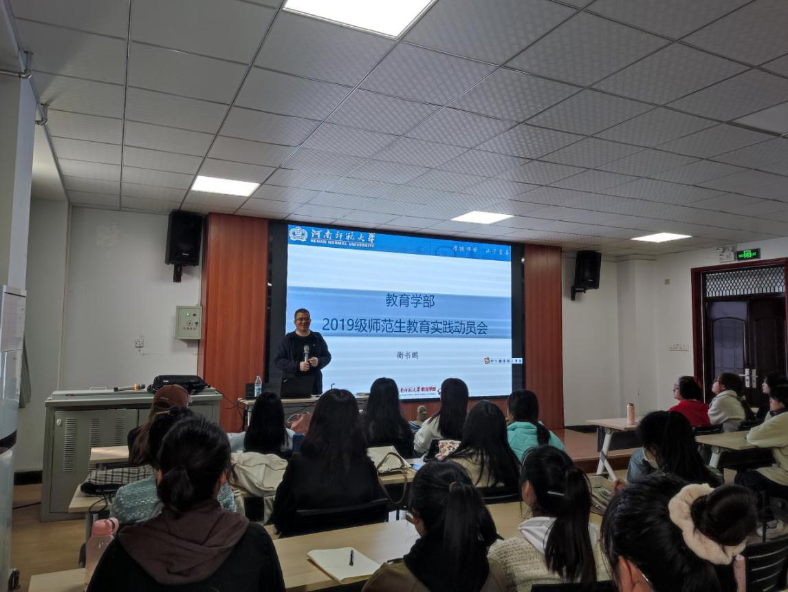 衡书鹏就什么是教育实践、教育实践对于师范生的重要意义、从教育实践中收获什么以及如何选择实习基地等一系列问题同学们做了详细讲解,并对实习相关注意事项进行了提醒。
