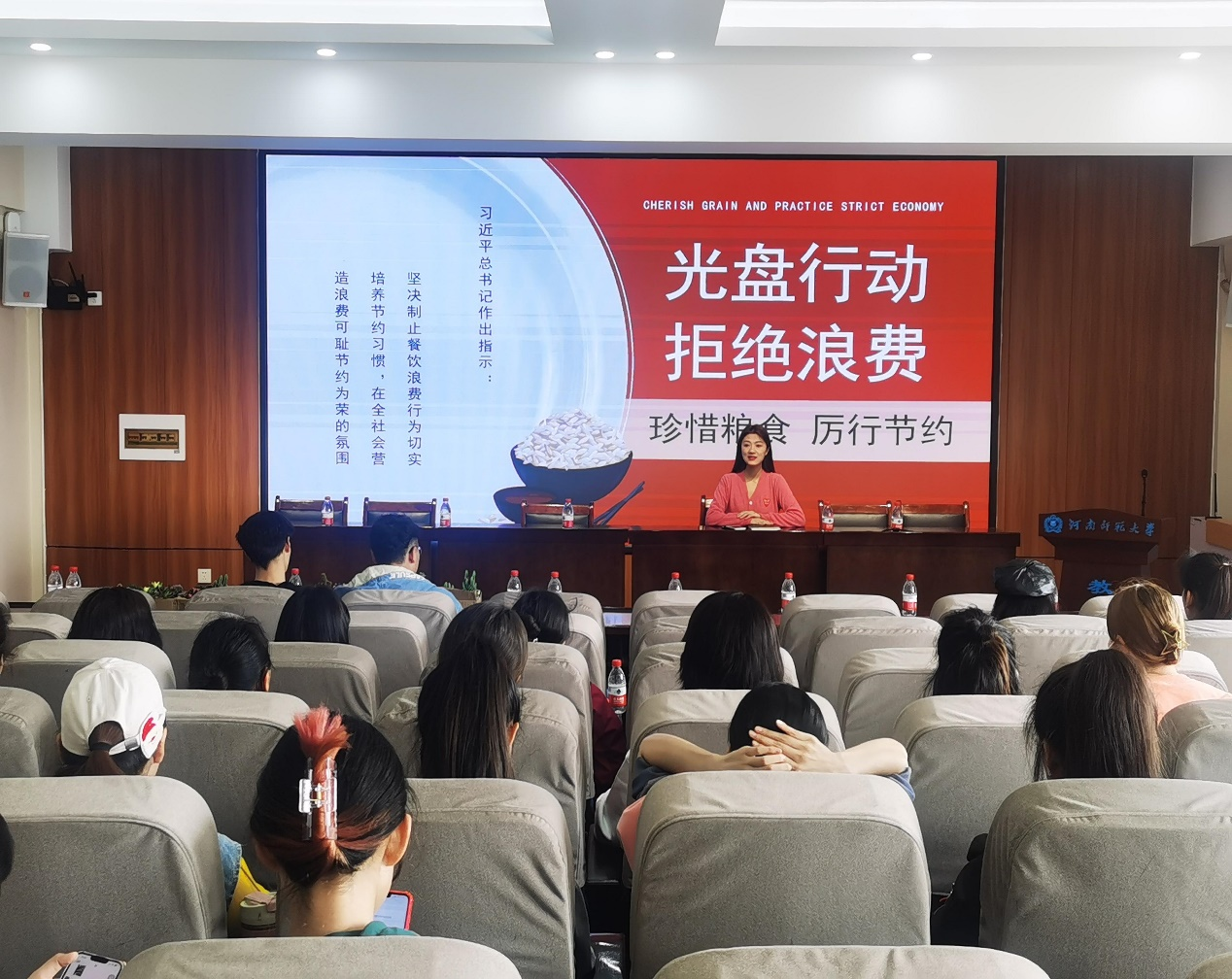 会上,石晓倩领学了习近平总书记对制止餐饮浪费行为作出的重要指示,指出了当前大学生在餐饮方面存在的浪费情况,并介绍了我校相关珍惜粮食工作的举措,告知大家目前餐厅饭菜均有大、小份之分,希望同学们根据实际需求购买。最后,石晓倩倡导同学们积极参与“光盘”行动,呼吁大家在生活中主动践行中华民族勤俭节约的传统美德。