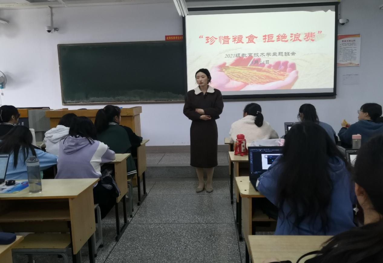 3月11日上午12点,教育学部2020级在东区文昌楼308教室开展“厉行勤俭节约,拒绝餐饮浪费”主题班会。2020级教育学、心理学、学前教育三个专业共133名学生线下参加班会,教育技术学、小学教育专业采取线上方式参会。