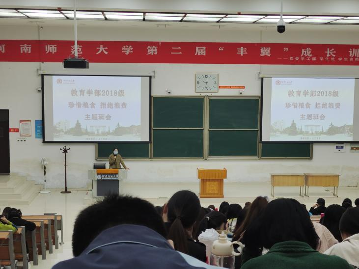 为切实贯彻落实习近平总书记提出的采取有效措施建立长效机制,坚决制止餐饮浪费行为的重要指示,推动大学生自觉养成珍惜粮食、适量取餐、避免剩餐、减少浪费的好习惯,教育学部2018级于3月11日晚在东区文昌楼102教室开展了“厉行勤俭节约,拒绝餐饮浪费”主题班会,2018级全体同学参加,会议由2018级辅导员石晓倩主持。