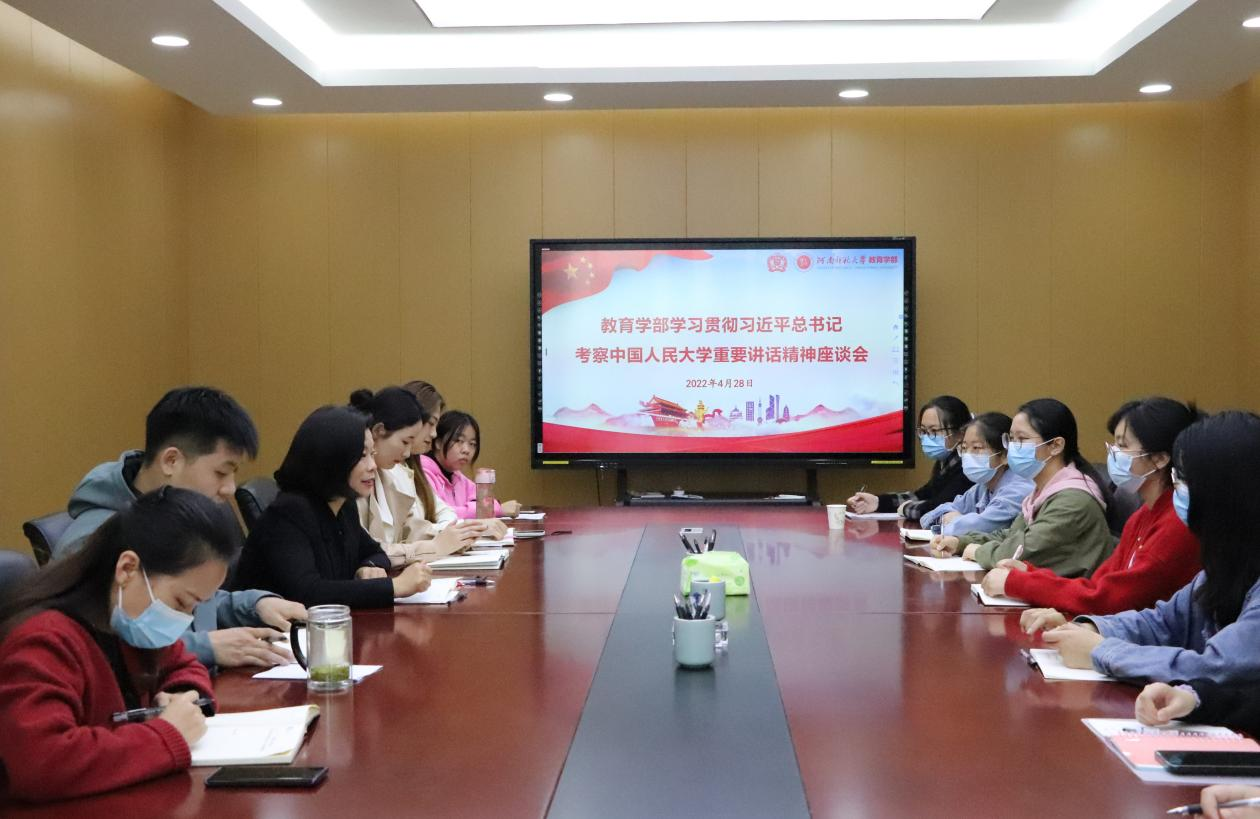 为深入学习贯彻习近平总书记考察中国人民大学重要讲话精神,教育学部于4月28日下午在田家炳教育书院801会议室召开学习贯彻习近平总书记考察中国人民大学重要讲话精神师生座谈会。学部党委副书记康淑霞、各年级辅导员和学生代表参加会议。