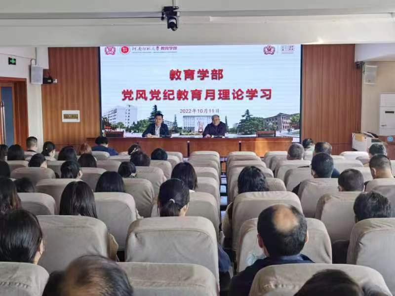 为深入学习贯彻习近平新时代中国特色社会主义思想和习近平总书记视察河南重要讲话重要指示,进一步加强党风廉政建设,扎实推进党风党纪教育月活动,切实推动学院全面从严治党向纵深发展,10月11日下午,教育学部于田家炳教育书院819会议室开展党风党纪教育月集中理论学习。学部党政领导班子成员、全体党员教师参加。会议由学部党委书记陈勇主持。