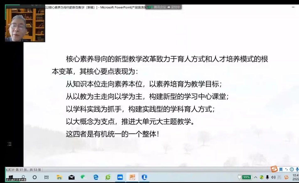 余文森教授分别从素养导向、学习中心、学科实践、单元教学四个方面,为老师们生动地诠释了新课标与新教学改革的方向和主题,并结合精彩教学案例,倡导基础教育一线教学实践要立足本地区、本学校、本学科的改革基础,点上突破,全面推进,继而构建核心素养导向的新时代新型教学。