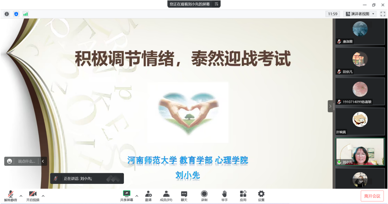在2023年硕士研究生入学考试临近之际,为帮助学部考研学子坚定信心、稳定心态,12月19日下午,教育学部心理学院院长刘小先通过腾讯会议的形式,为学部考研学子进行了《积极调节情绪,泰然迎接考试》为主题的心理辅导。本次讲座由学部党委副书记康淑霞主持。