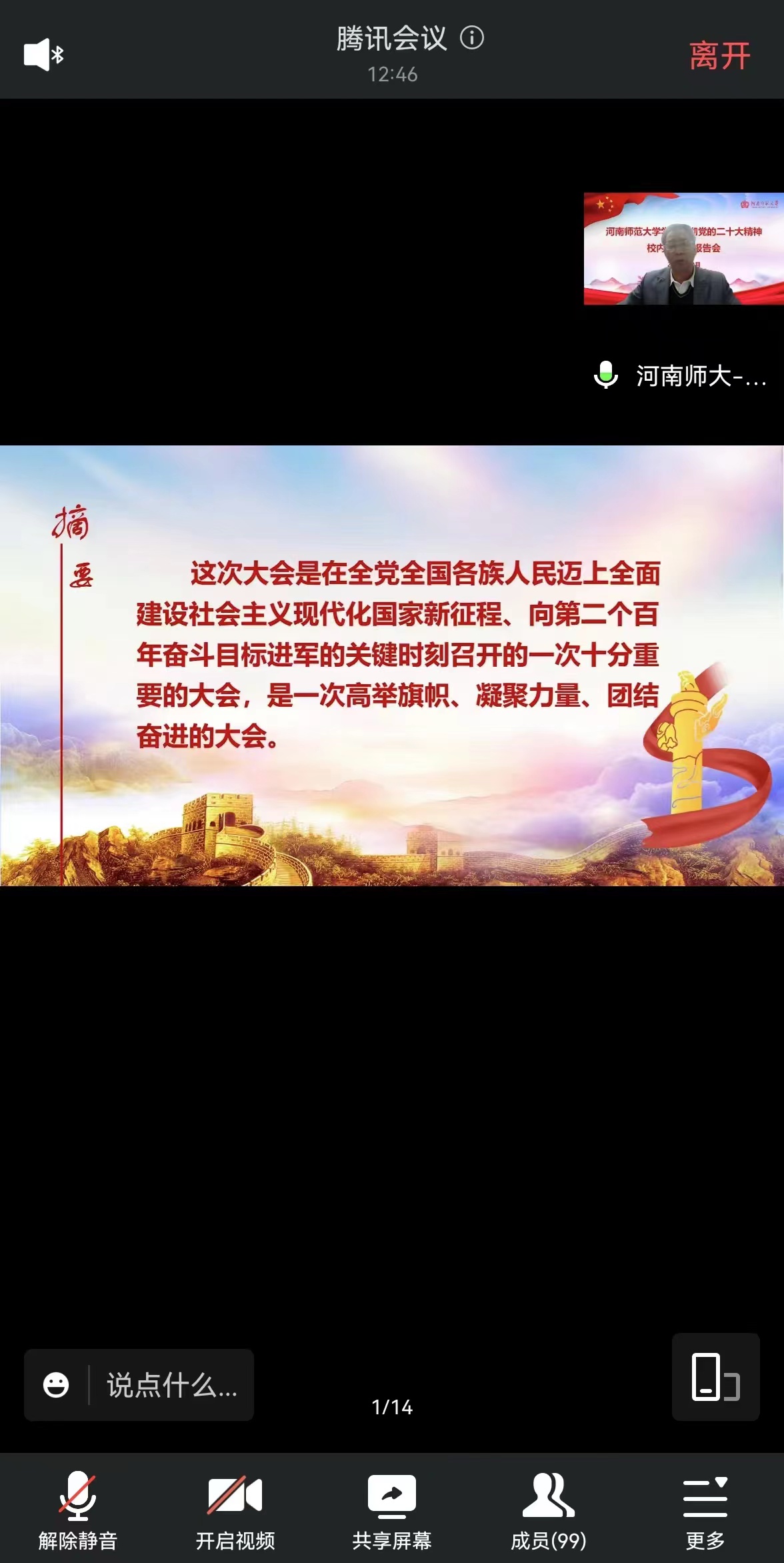 为深入学习宣传贯彻党的二十大精神,引导广大教职工全面准确领会党的二十大精神,深刻领悟“两个确立”的决定性意义,增强“四个意识”、坚定“四个自信”、做到“两个维护”,1220日下午,党的二十大精神校内宣讲团专家、马克思主义学院院长蒋占峰教授应邀以线上方式为教育学部、数学与信息科学学院、后勤管理处作党的二十大精神专题宣讲报告。三个单位党政领导班子成员、全体教职工聆听了本次报告。