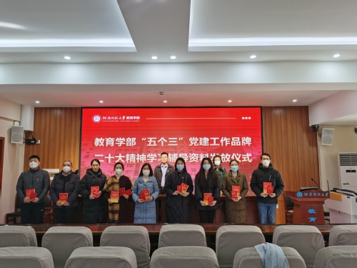 会后,进行了教育学部“五个三”党建工作品牌党的二十大精神学习辅导资料发放仪式,为各支部发放党的二十大报告、报告学习辅导百问和中国共产党章程等学习资料。