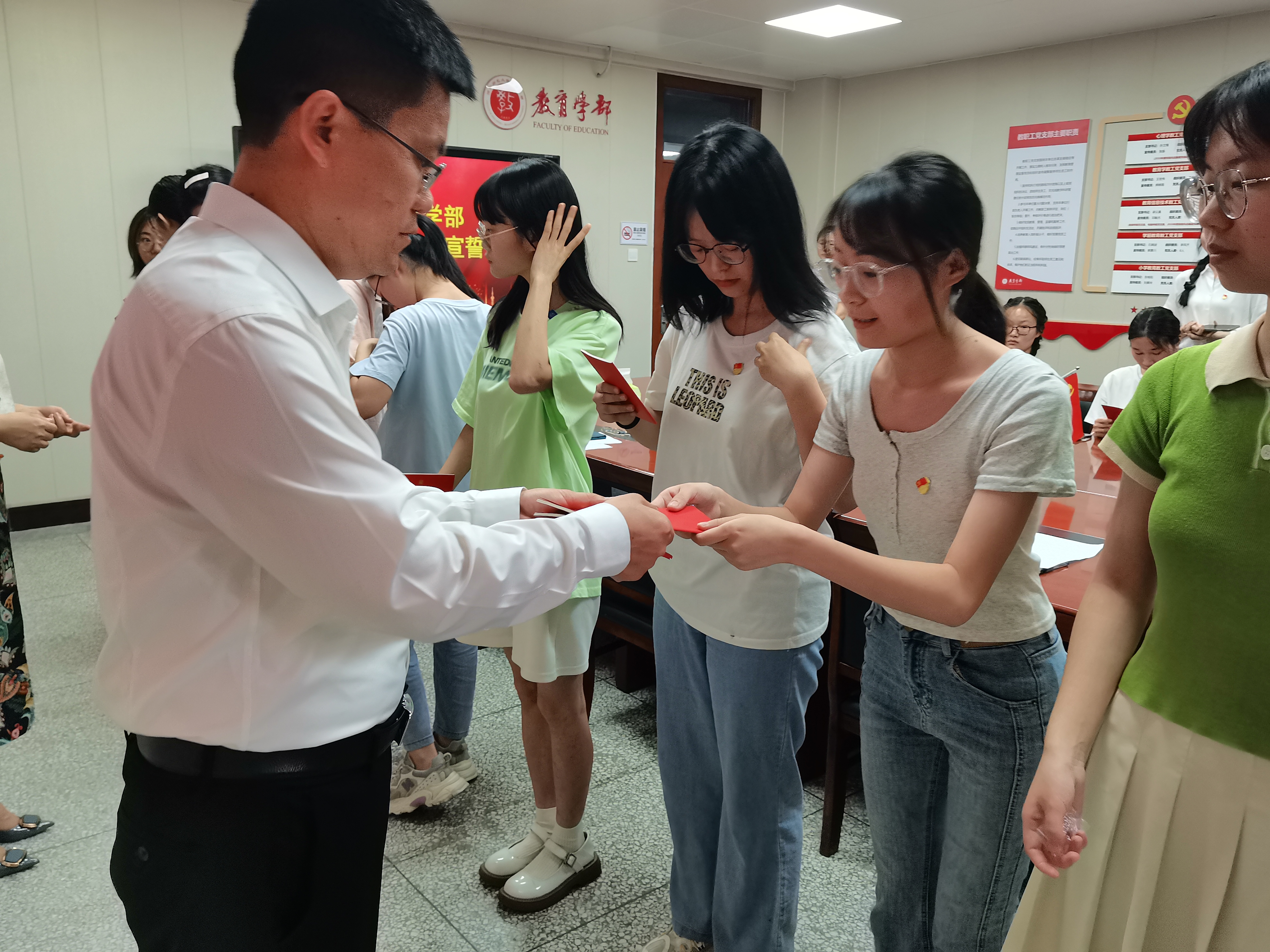 活动伊始,新发展党员入党宣誓仪式在庄严肃穆的国歌声中拉开序幕。全体与会党员在本科生第四党支部书记陈赞赞的带领下,面向党旗庄严宣誓,表达对党的无限忠诚和为党的事业奋斗终身的坚定信念。随后,与会领导为预备党员佩戴党员党徽,发放《中国共产党章程》,进一步强化党员的身份意识,激发党员的政治热情。