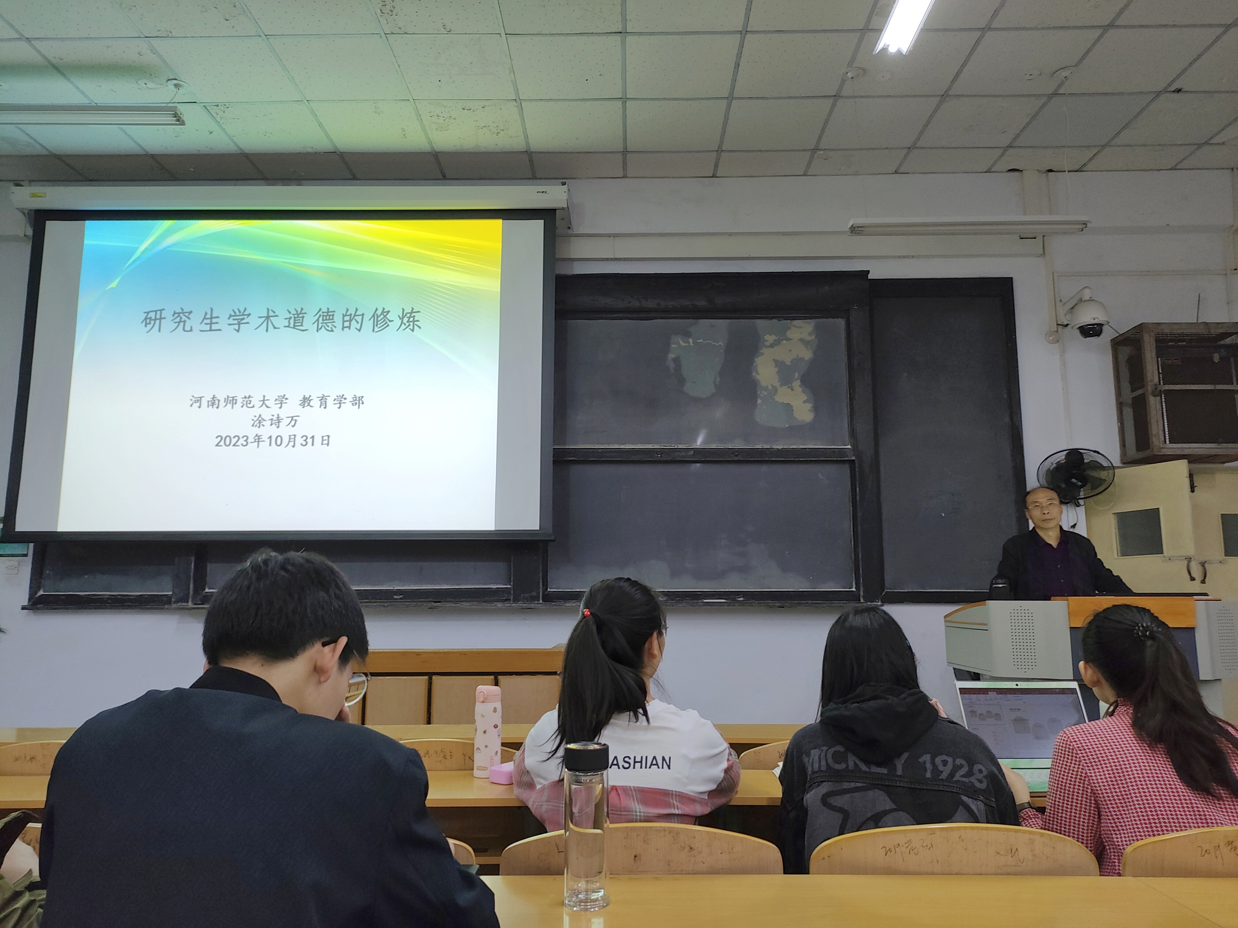 10月31日晚,教育学部在文渊楼221教室开展第三期研究生读书会,学部涂诗万副教授受邀为2023级200余位硕士研究生作“研究生学术道德的修炼”主题讲座。
