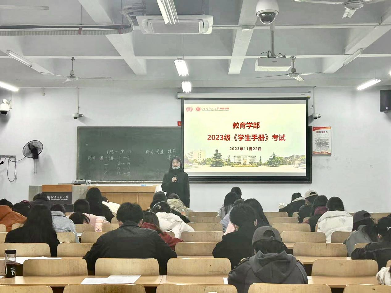 为帮助2023级新生深入了解学校规章制度,加强新生养成良好行为规范,教育学部于11月22日在启智楼107教室组织2023级新生进行《学生手册》考试。
