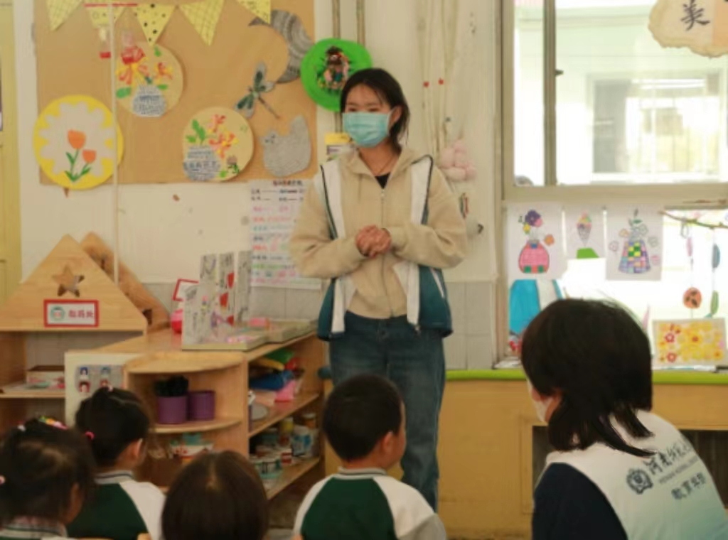 此次活动共有“童心画笔绘世界”、“创意手工拼梦想”两种活动形式。实践活动初始,学生以富有童趣的导入方式为小朋友们展示色彩缤纷的创意手工作品,吸引小朋友们的兴趣和好奇心,引出绘画与手工的要素、技巧等知识。随后学生们将自身所学专业技能融入实践活动中,耐心地带领小朋友们一笔一画勾勒出充满童心的世界,引导小朋友们展开丰富的想象力,亲自动手尝试用粘土拼贴出自己喜爱的礼物。一块块彩泥在巧手下展现出千姿百态,一笔笔线条有了生气与温度,做出独属于自己作品后,喜悦的笑容洋溢在每个孩子纯真的脸上。