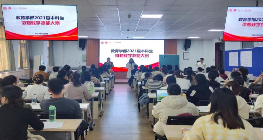 12月8日下午,教育学部2021级本科生微格教学技能大赛在田家炳602教室举行,来自教育学院、教育信息技术学院、心理学院、教师教育学院的15位选手参加比赛,学部100余名师生参与现场观摩。