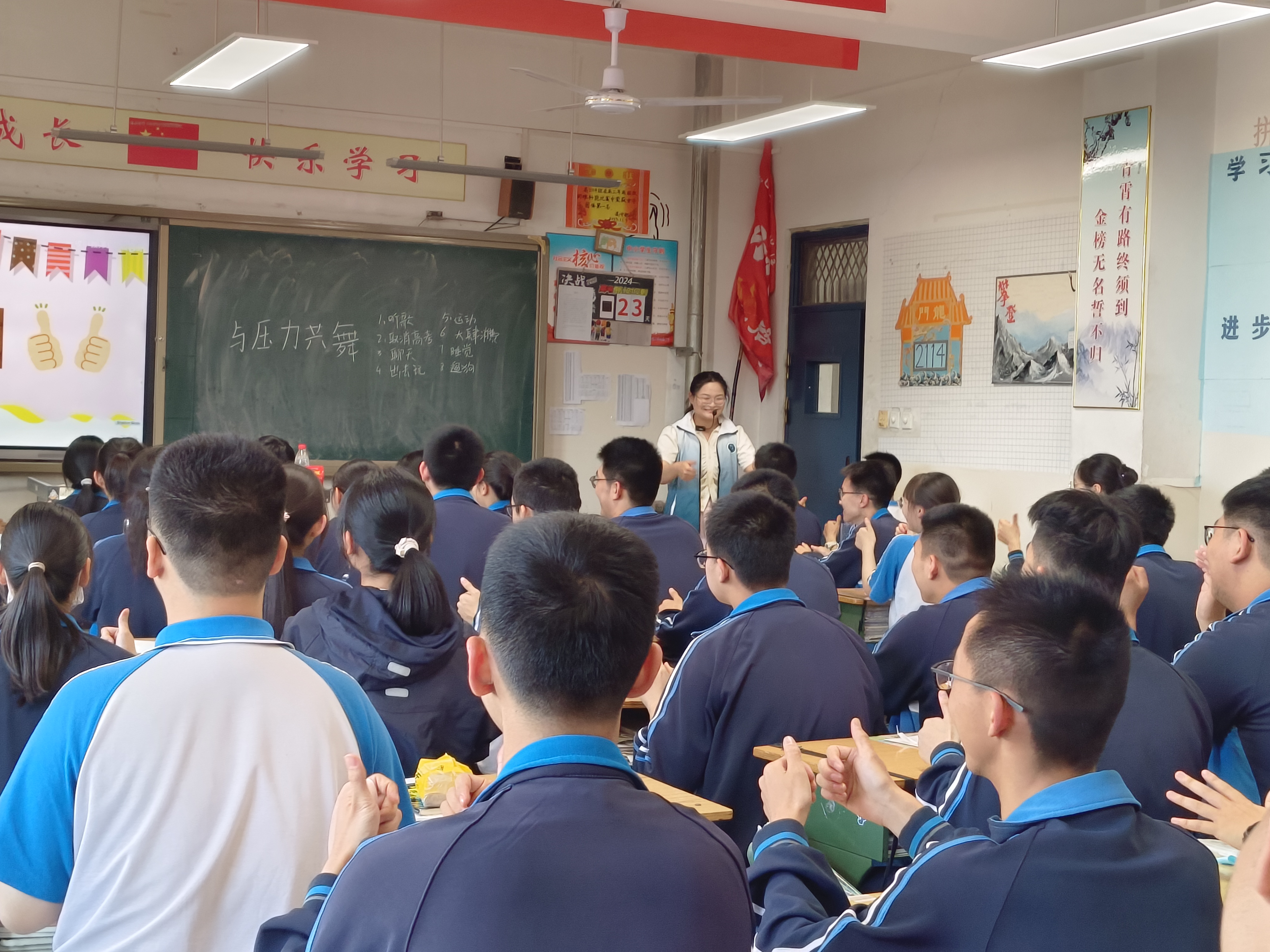 活动共分为四个环节,旨在引导同学们感知、正视压力,学会调节和转化压力。活动伊始,志愿者带领同学们进行了“老师说”热身游戏,现场气氛迅速活跃起来。“头脑风暴”环节,通过快问快答引导同学们正确认识压力,通过压力打分,使他们明白适度的压力能够保持最佳的学习状态。“笑对压力”环节,志愿者分享了“五感解压法”,带领大家一起进行“解压操”“十指健身操”,同学们积极参加,现场热闹非凡。“祝福飘飘”环节,同学们在丝带上写下对自己和他人的祝福,提升正面情绪,传递正能量。参与学生纷纷表示,以前面对压力时常感到焦虑和不安,通过这次活动,意识到压力是生活中不可避免的一部分,学习到了应对压力的方法和技巧,更加有信心面对即将到来的高考。