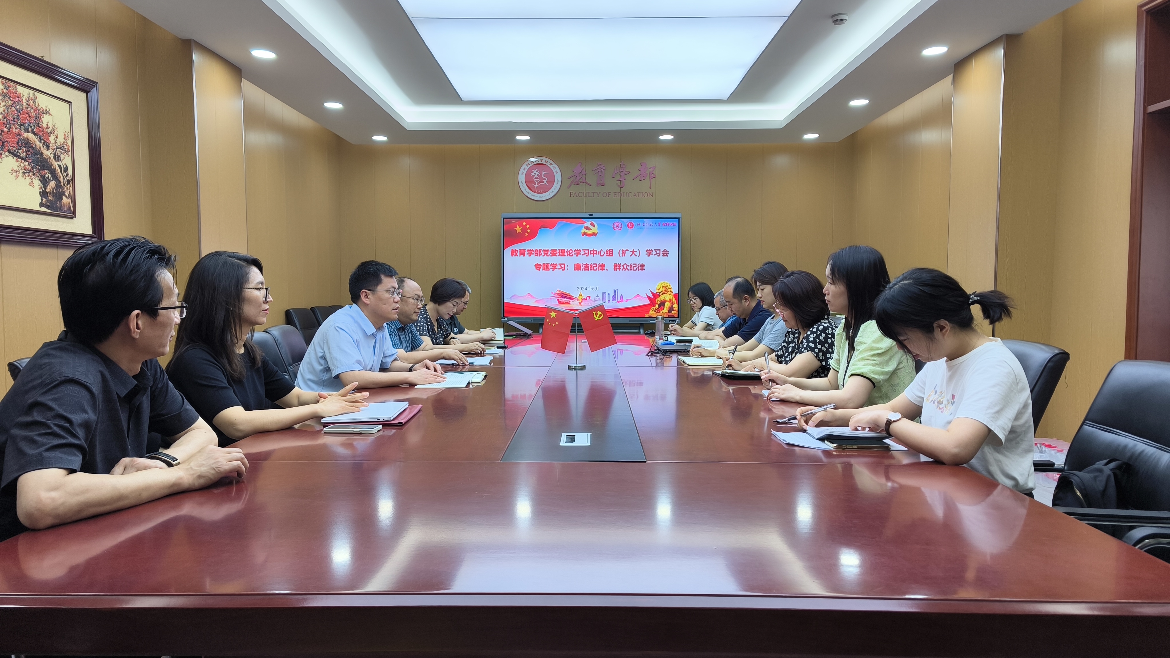 5月30日上午,教育学部党委在田家炳教育书院801会议室召开党委理论学习中心组(扩大)学习会,以《中国共产党纪律处分条例》为主题,围绕“廉洁纪律、群众纪律”开展集中学习,学部党委理论学习中心组成员、教工党支部书记参加学习。学部党委书记陈勇主持会议。