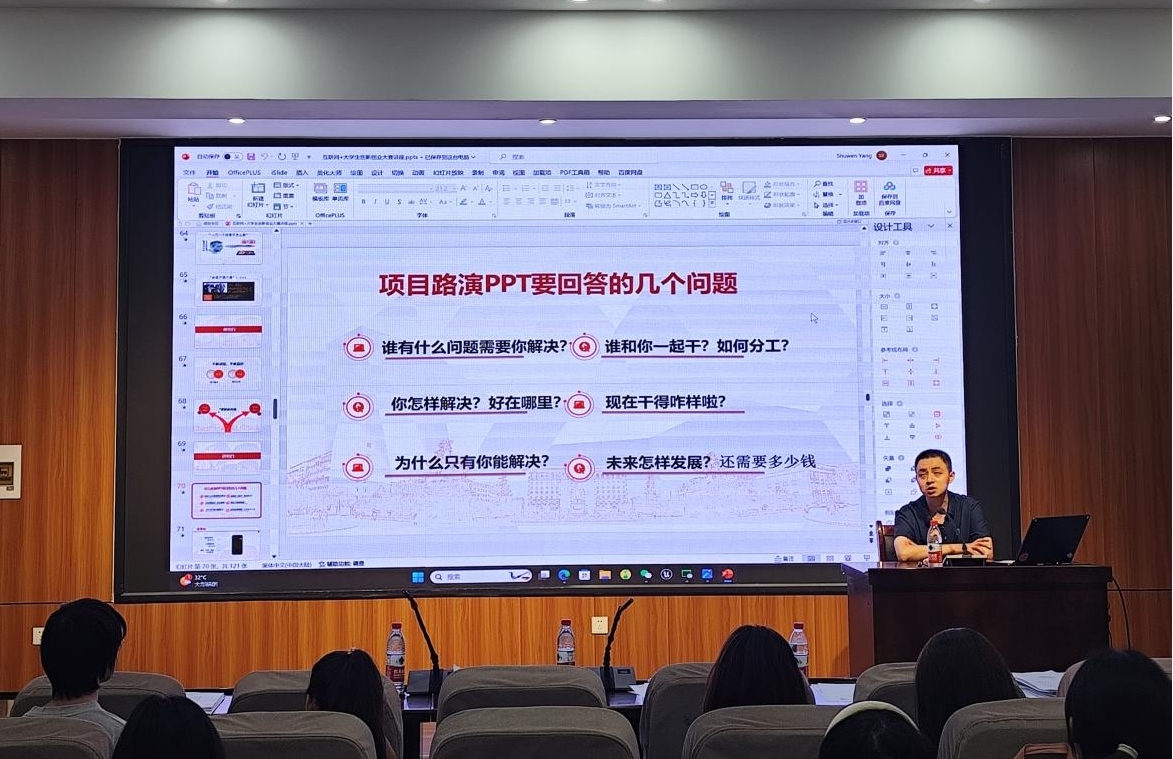 比赛结束后,王科从赛道选择、团队组建、项目来源、PPT优化、项目计划书撰写以及优秀案例展示六个方面展开详细讲解,他指出,同学们要夯实理论基础,关注社会焦点问题,构建良好的团队结构;重视PPT的设计,做到图文并茂、逻辑清晰、重点突出、层析分明;撰写计划书时,要深入调研市场需求,确保项目的实际应用价值,考虑可能遇到的风险和挑战,并提出应对策略。通过优秀案例展示和分析,他呼吁同学们要多学习借鉴以往成功的经验,关注技术创新,注重市场需求和用户体验的结合,不断提升创新能力和实践水平,以打造具有市场竞争力的优秀项目。