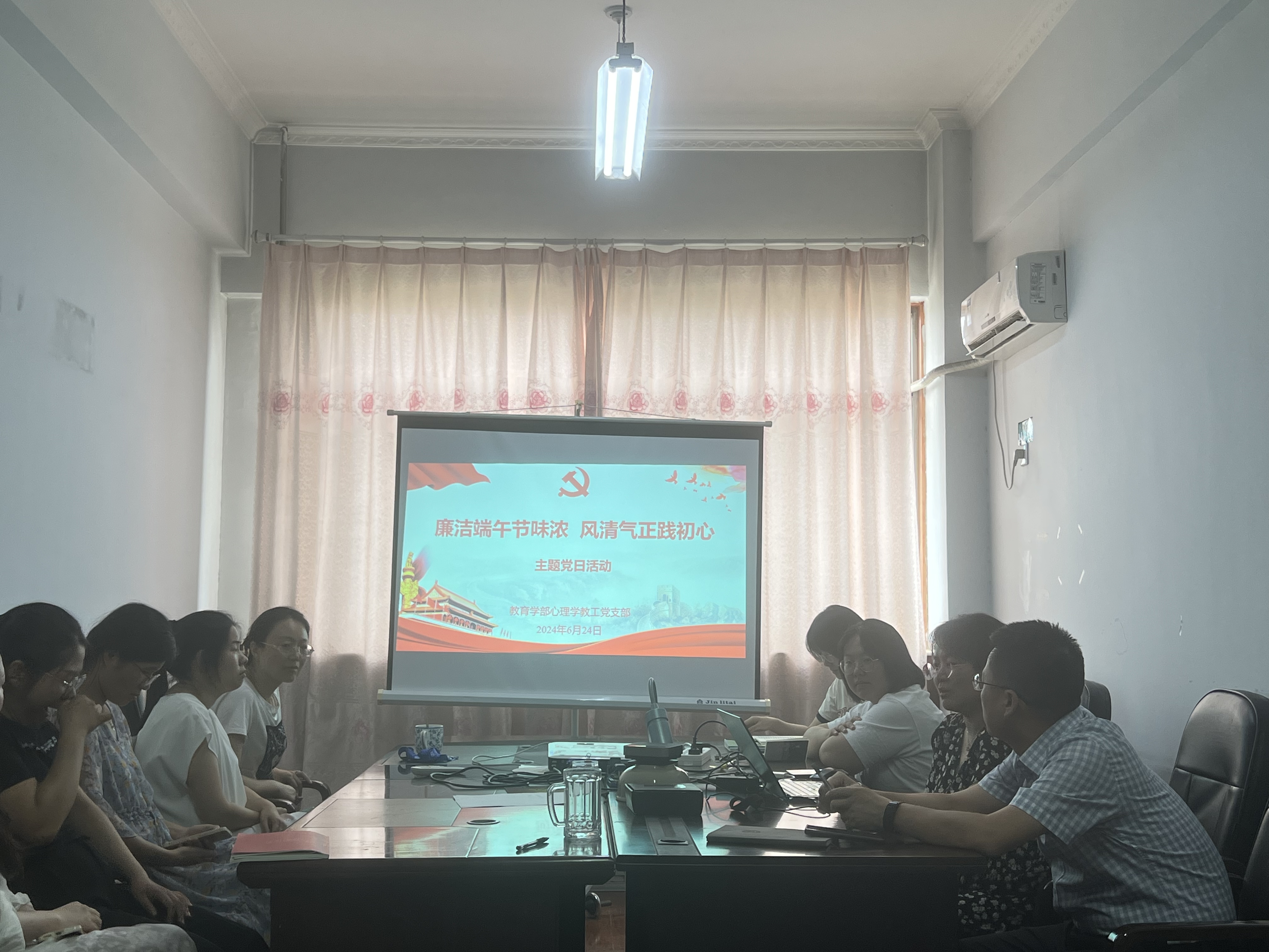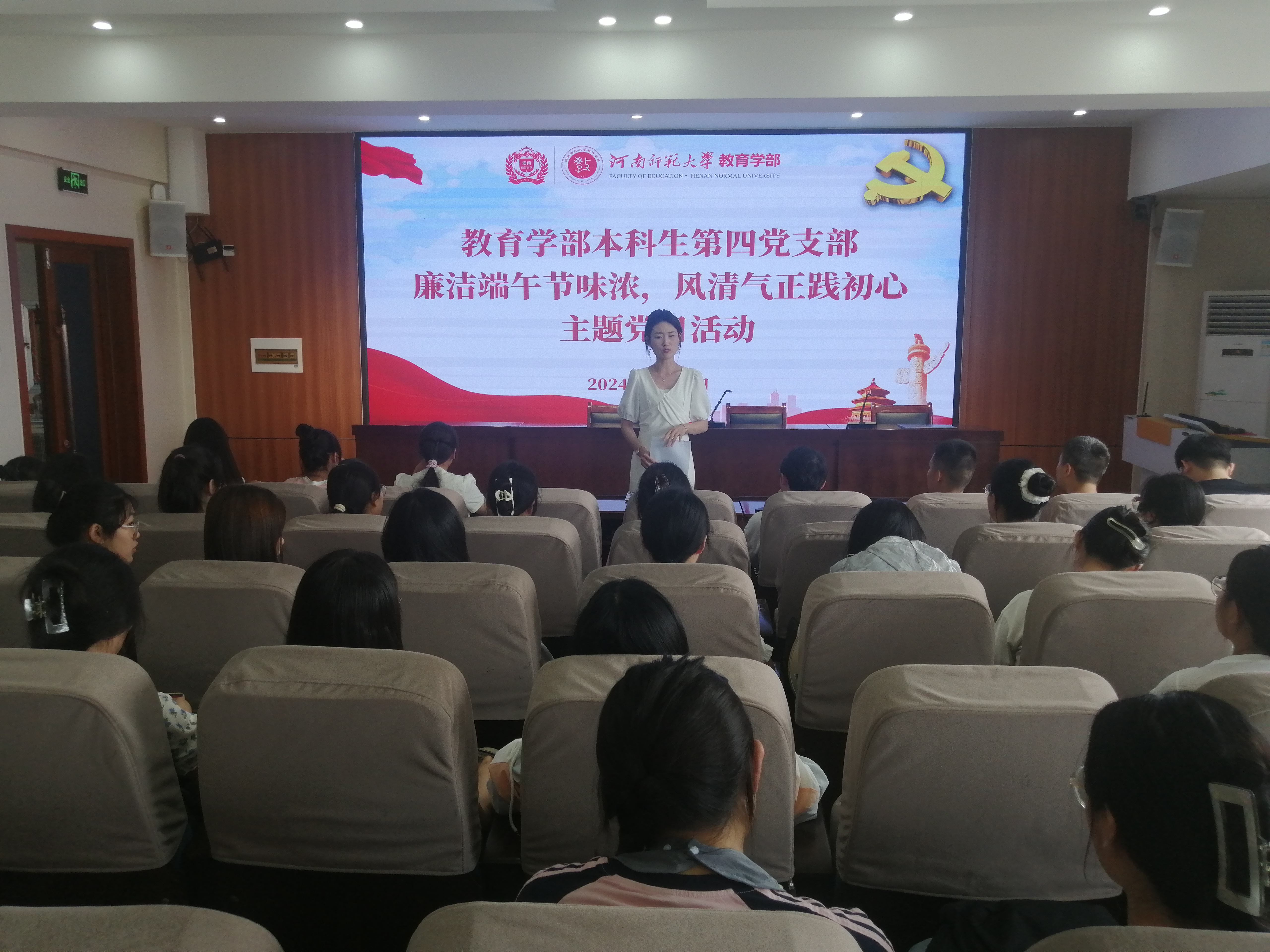 为进一步巩固拓展学习贯彻习近平新时代中国特色社会主义思想主题教育成果,6月18日,教育学部本科生第四党支部在田家炳819会议室开展“廉洁端午节味浓,风清气正践初心”主题党日活动。本次会议由党支部书记陈赞赞主持,支部全体党员参加。会议伊始,党支部书记陈赞赞结合新修订的《中国共产党纪律处分条例》,明确党纪学习教育重点内容。她强调作为一名学生党员,要加强政治理论学习,强化纪律规矩意识,遵守各项管理规定,坚持原则,勇于担当,争当先进,行为示范。