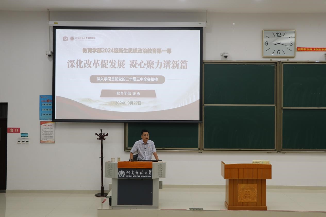为深入学习贯彻党的二十届三中全会精神,927日晚,教育学部在文昌楼302教室开展秋季开学思政第一课,学部全体政工干部和学生代表近400人参加。学部党委书记陈勇担任主讲。