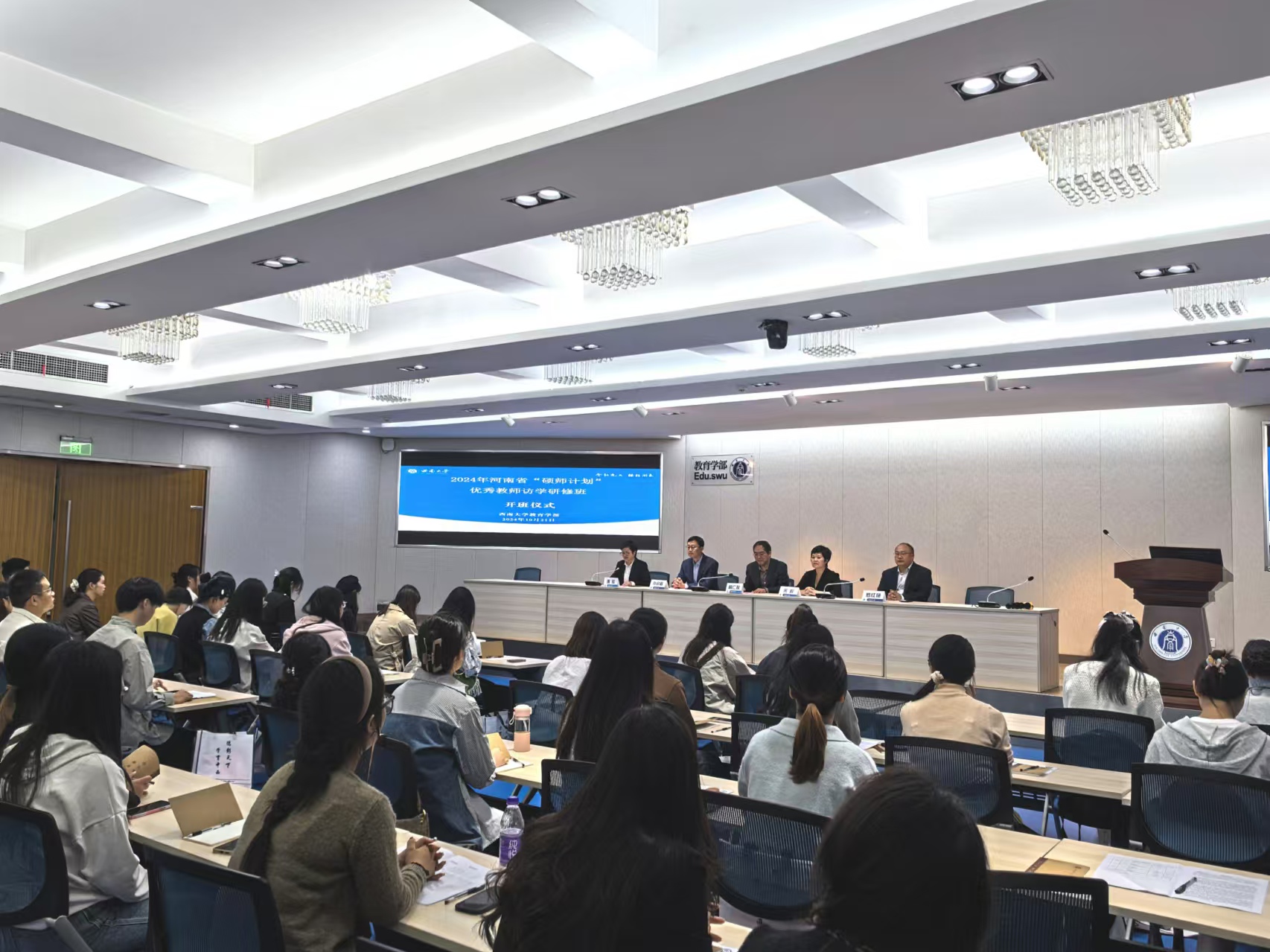 10月21日上午,由河南省教育厅主办、伟德官网下载苹果版教育学部承办的2024年度“硕师计划”优秀教师访学活动在西南大学举行。西南大学教育学部原党委书记韩仁友、河南省教育厅教师工作处副处长张会敏、伟德官网下载苹果版副校长宋晔致辞,伟德官网下载苹果版教育学部部长罗红艳、西南大学教育学部部务助理谯宏出席会议,2021届本科毕业签约“硕师计划”的50位优秀教师参加本次访学活动。