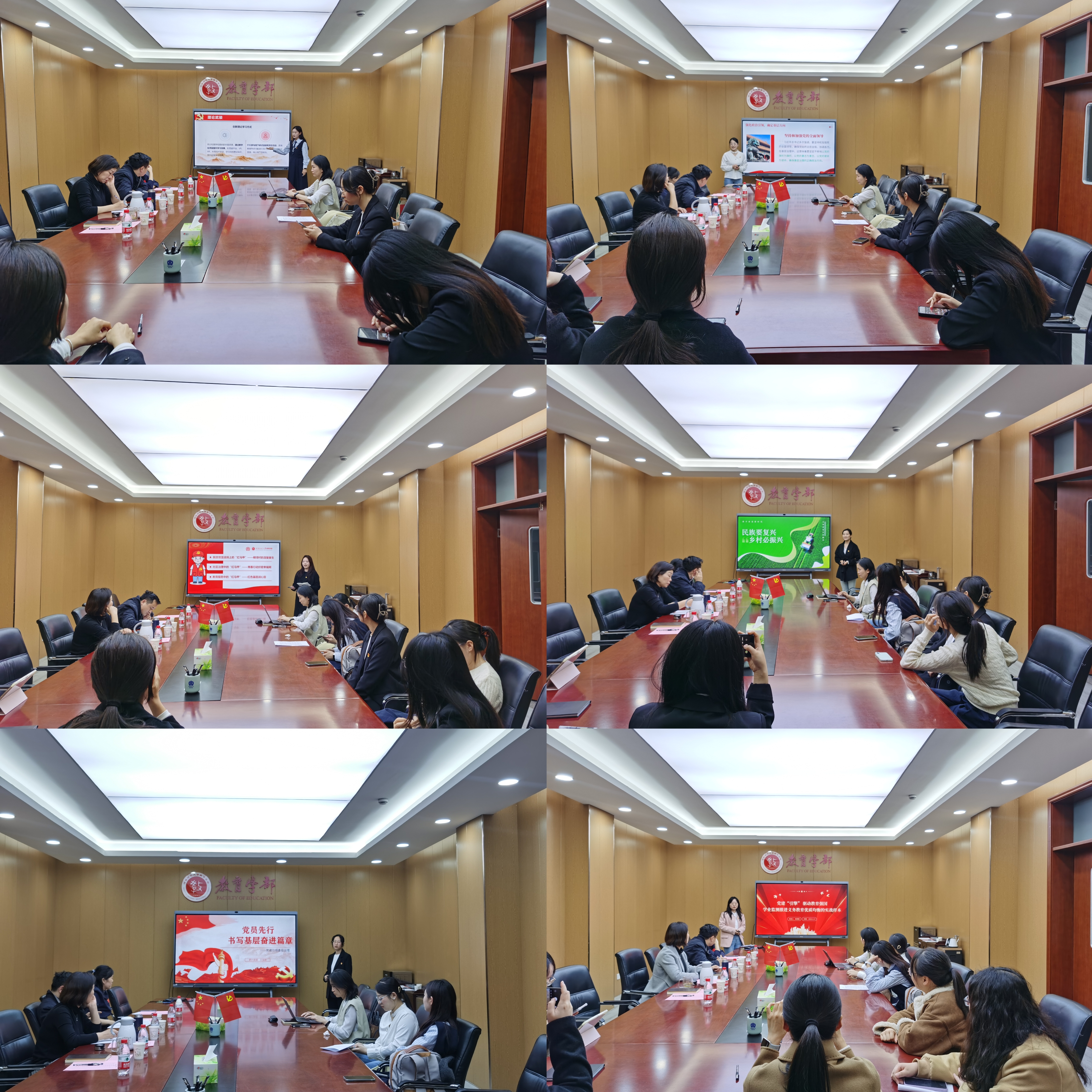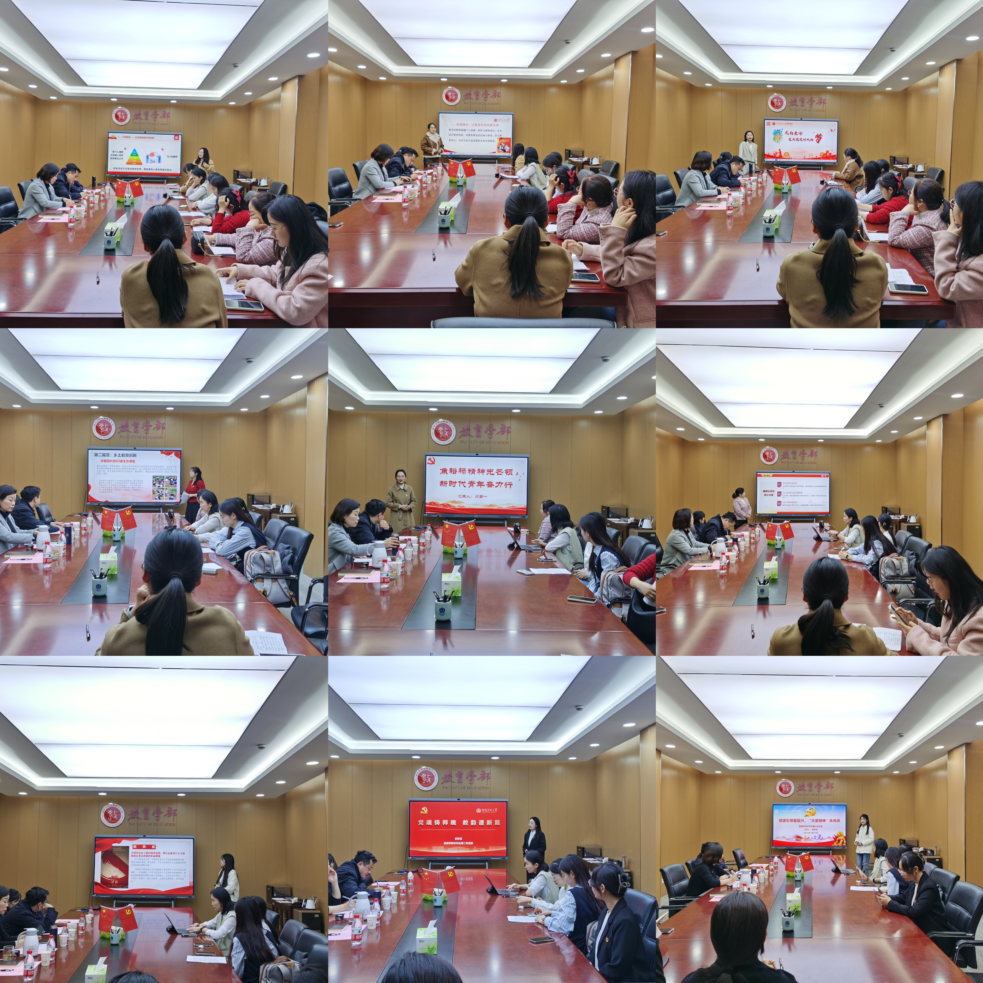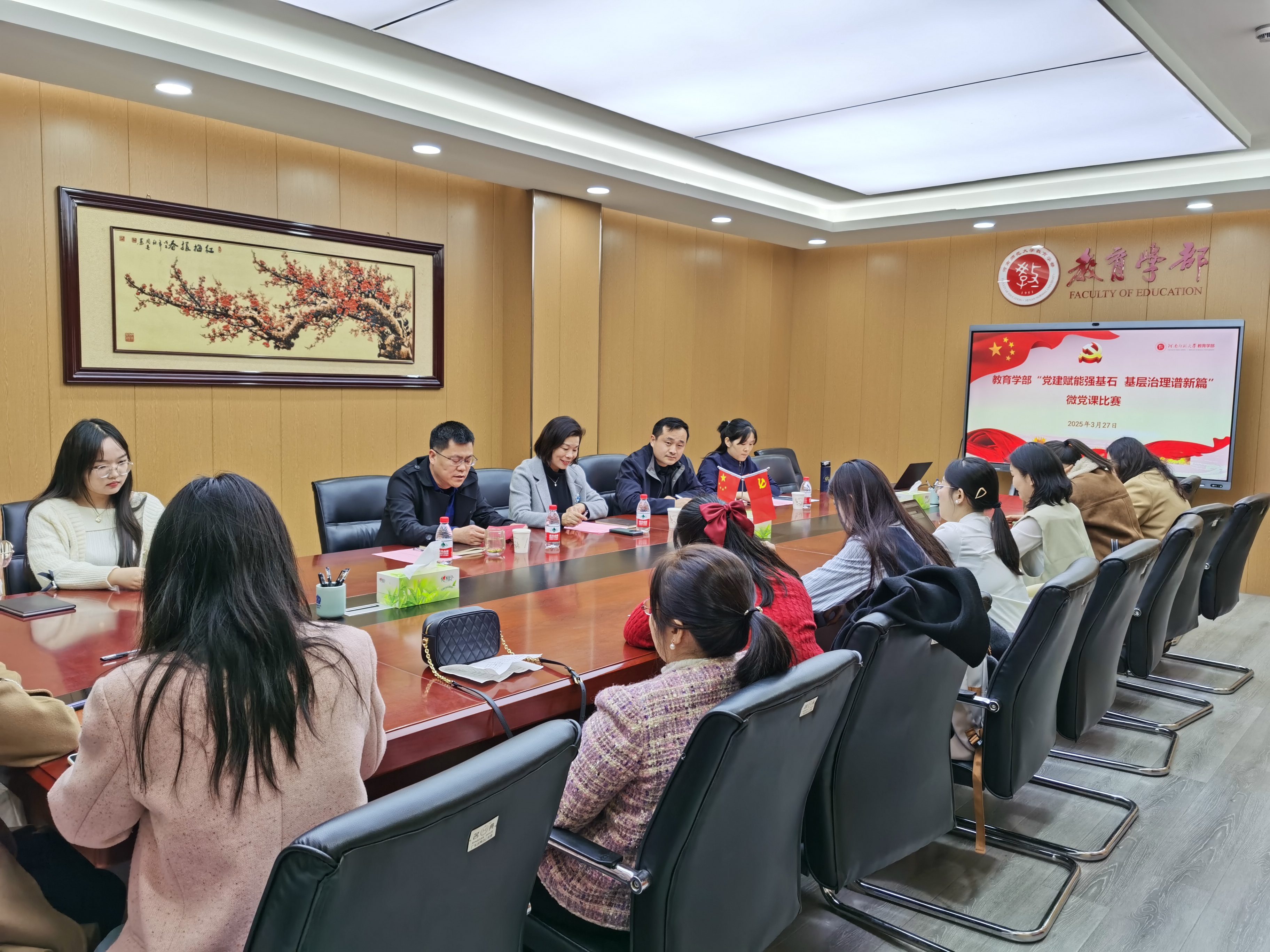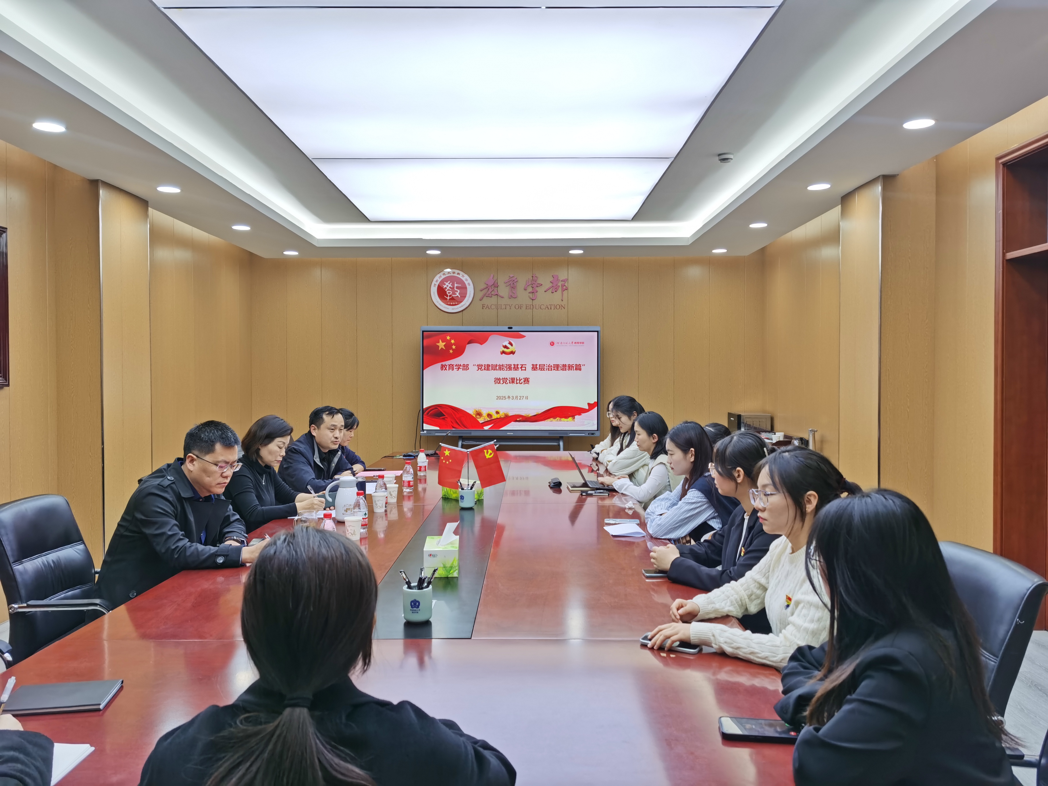为深入学习贯彻党的二十大和二十届三中全会精神,全面贯彻习近平总书记关于基层治理的重要论述,深化党建引领基层治理的创新实践,推动党的组织优势转化为治理效能,讲好广大党员干部在基层治理中涌现出的“师大先锋故事”,3月27日,教育学部在田家炳教育书院801会议室举办“点亮师大红”微党课比赛。比赛邀请材料科学与工程学院党总支副书记董长雨、体育学院党委组织员石教乐和教育学部党委副书记康淑霞担任评委。来自学部各党支部推荐的7名教师党员和9名学生党员参加比赛。学部党委书记陈勇做开赛讲话并观看比赛。