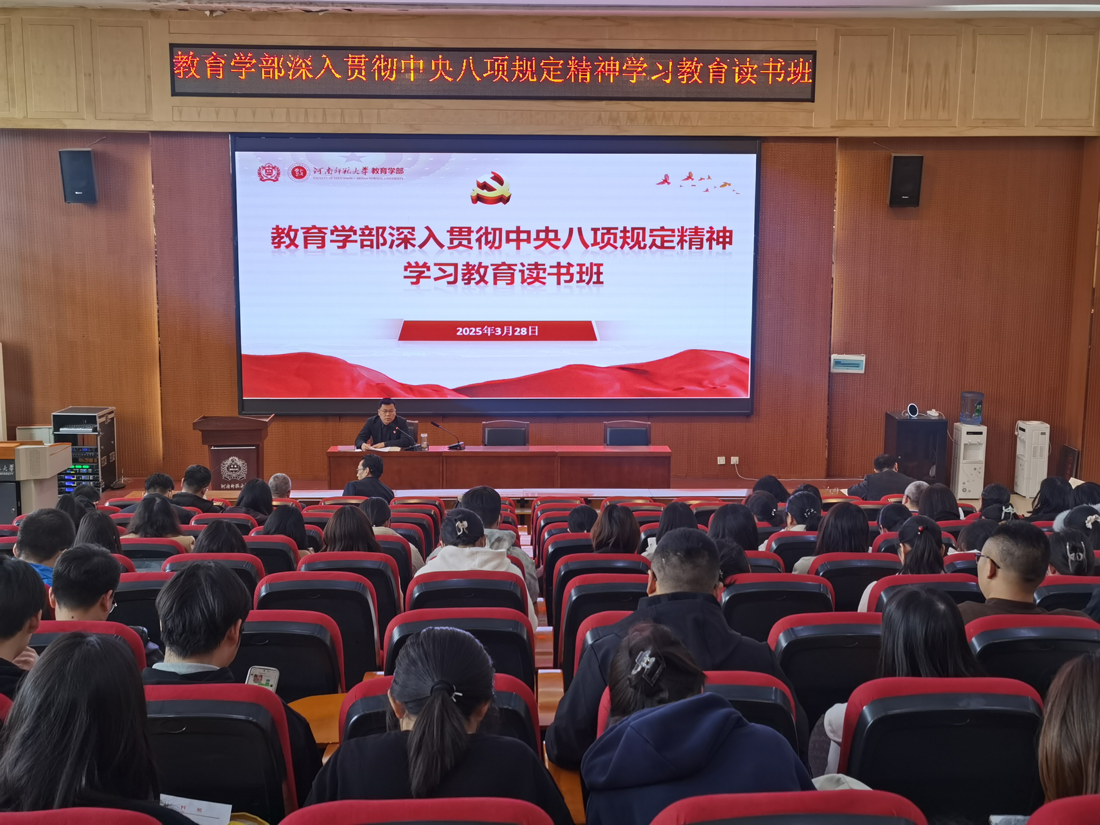 为深入贯彻中央八项规定精神学习教育走深走实,根据校党委相关部署要求,3月27-28日,教育学部开展深入贯彻中央八项规定精神学习教育读书班。在专家辅导、个人自学基础上,28日下午,在东区求是中楼302教室举行深入贯彻中央八项规定精神学习教育读书班集体学习与交流研讨,学部全体师生党员参加,学部党委书记陈勇主持。