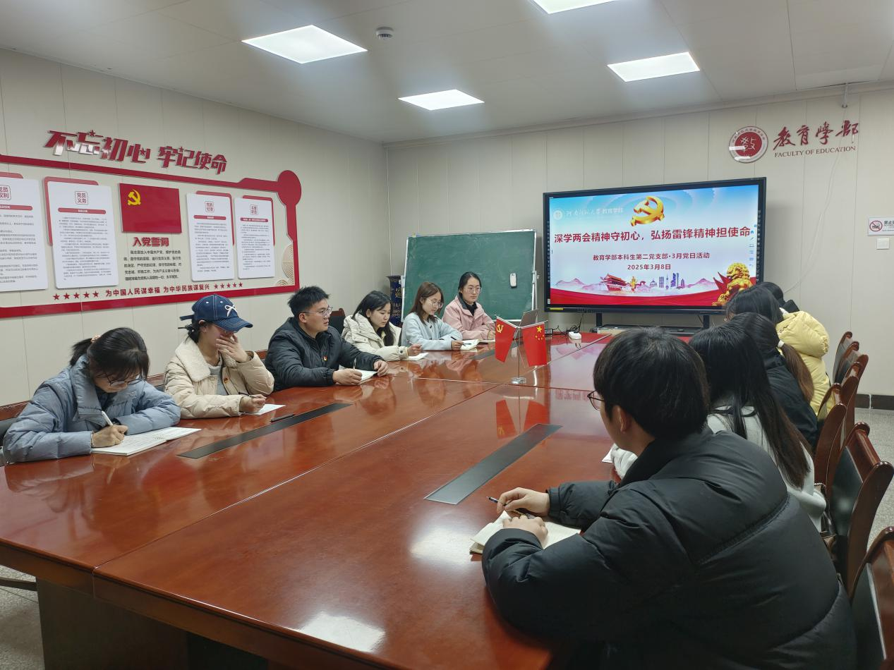 为全面贯彻落实党的二十大和二十届三中全会精神,巩固拓展主题教育和党纪学习教育成果,增强支部政治功能和组织功能,3月8日,教育学部本科生第二党支部在田家炳807会议室开展“深学两会精神守初心,弘扬雷锋精神担使命”主题党日活动。会议由支部书记尹晓炯同志主持,支部党员及预备党员参与此次活动。
