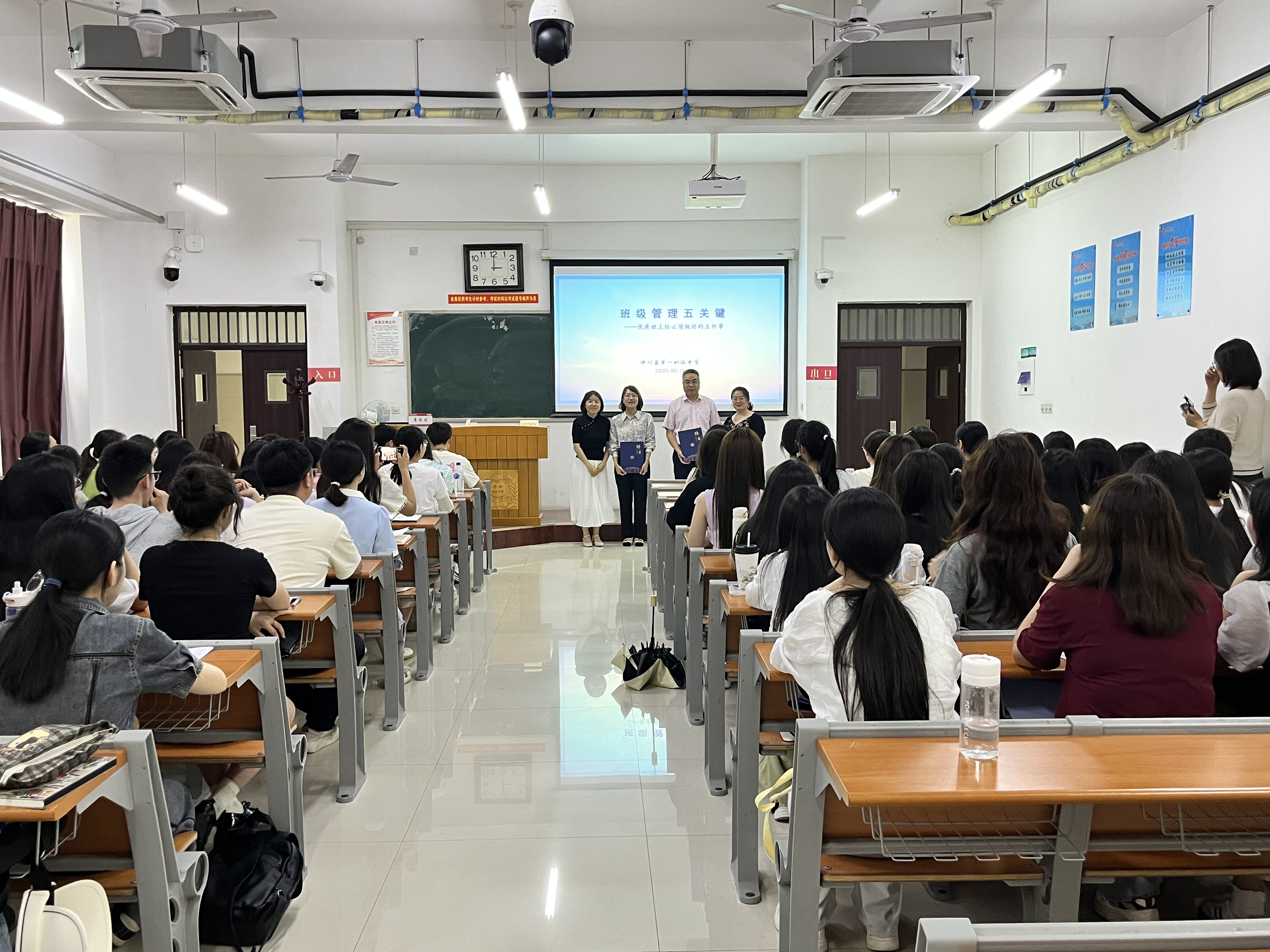 鲁俊莉以“班级管理五关键——优秀班主任必须做好的五件事”为主题,指出班子建设与制度规范是班级管理前提,详细讲解了班子建设五原则和班干部配备标准,强调制度对班级管理的重要性。她还介绍了班干部培训会等活动组织要点,阐述了确立发展目标的方法,强调体育基础对学生发展的保障作用,呼吁教师用爱育人。雷志华聚焦“砺精粹,仰高远——班级小德育建设”,分享班主任工作体验,提出同心同向等班级管理目标。他介绍“五自教育”理念,包括生活自立、行动自律等,并通过爱国主义教育等主题活动案例,展现德育融入班级管理的实践。同时也请同学们重视家校共育对学生成长的意义。