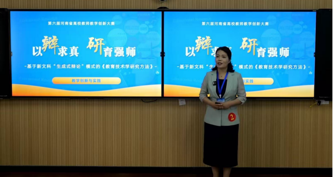 5月23-24日,第六届河南省本科高校教师课堂教学创新大赛决赛在河南大学举办。教育学部教育信息技术学院李小娟老师基于《教育技术学研究方法》课程的“生成式辩论”教学创新与实践,进行了“以辩求真 研育强师”创新主题汇报,荣获新文科副教授组一等奖。