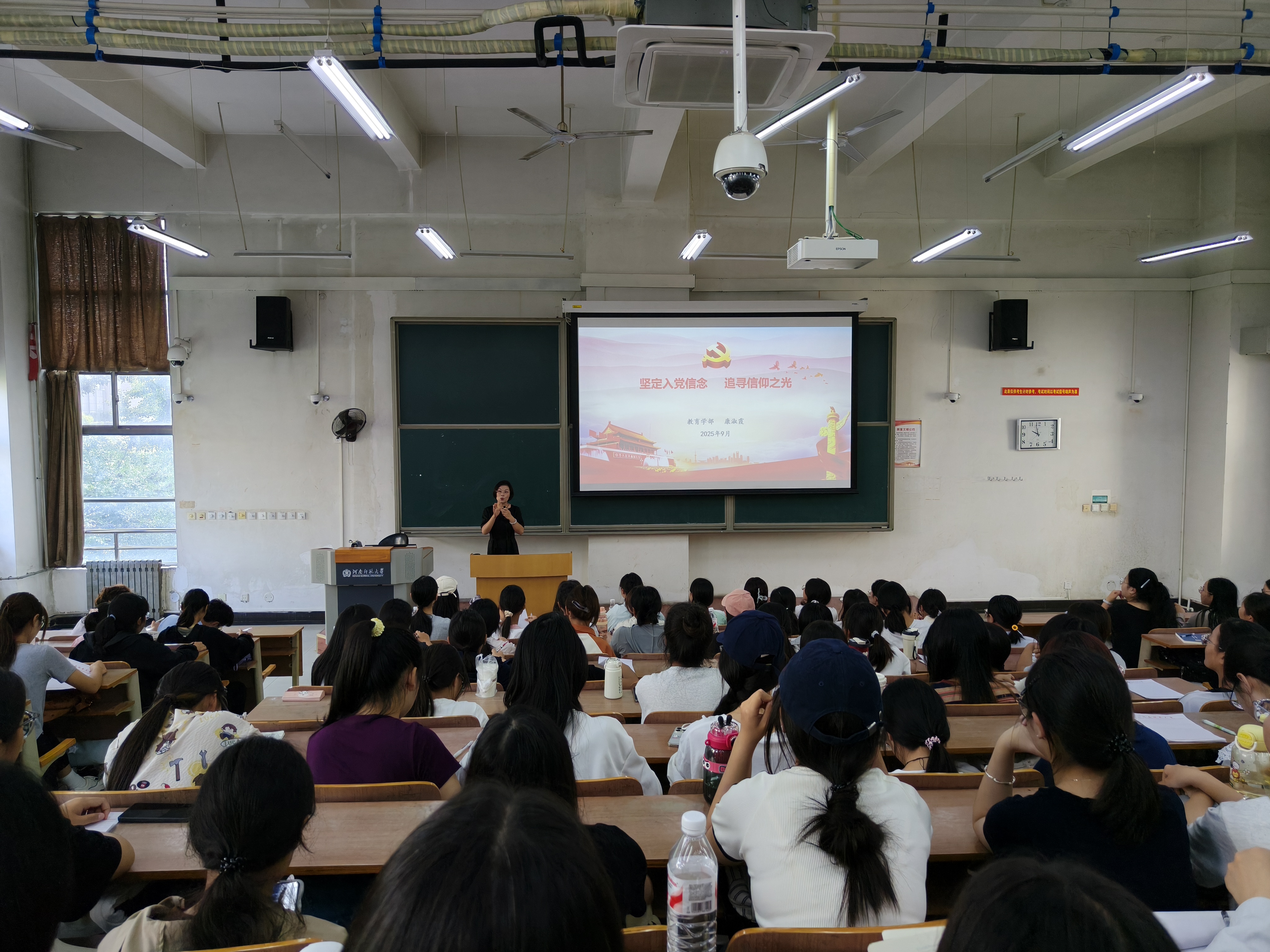 学部党委副书记康淑霞以“坚定入党信念 追寻信仰之光”为题,围绕“学习党的知识,筑牢信仰之基”“端正入党动机,把稳思想之舵”“了解入党程序,明晰努力方向”“争做合格党员,践行初心使命”四个方面,为新生们带来了一场系统而深刻的入党启蒙讲座。她结合《中国共产党章程中对党的性质、宗旨等表述及百年党史辉煌成就,深入浅出地向同学们阐述了中国共产党是一个什么样的政党,教育同学们要通过理论学习、实践锻炼,不断端正入党动机,全面了解入党的具体流程与要求,为成为合格党员不懈努力。她寄语全体新生,要珍惜大学时光,以党员标准严格要求自己,自觉接受党组织的培养和考验,在理论学习中筑牢信仰,在实践锻炼中增强本领争取早日站在党旗下,为实现中华民族伟大复兴的中国梦贡献青春力量。